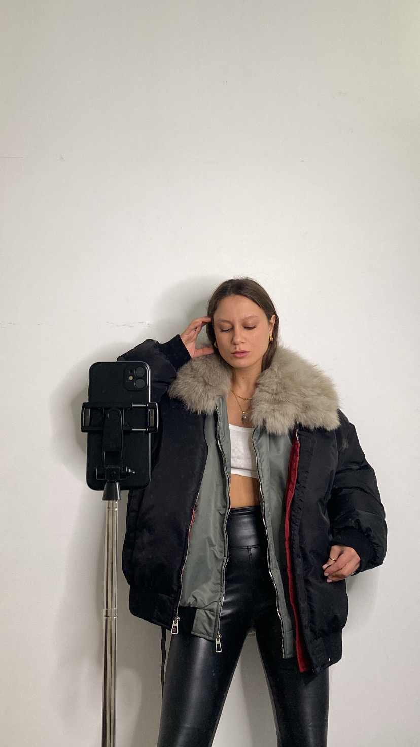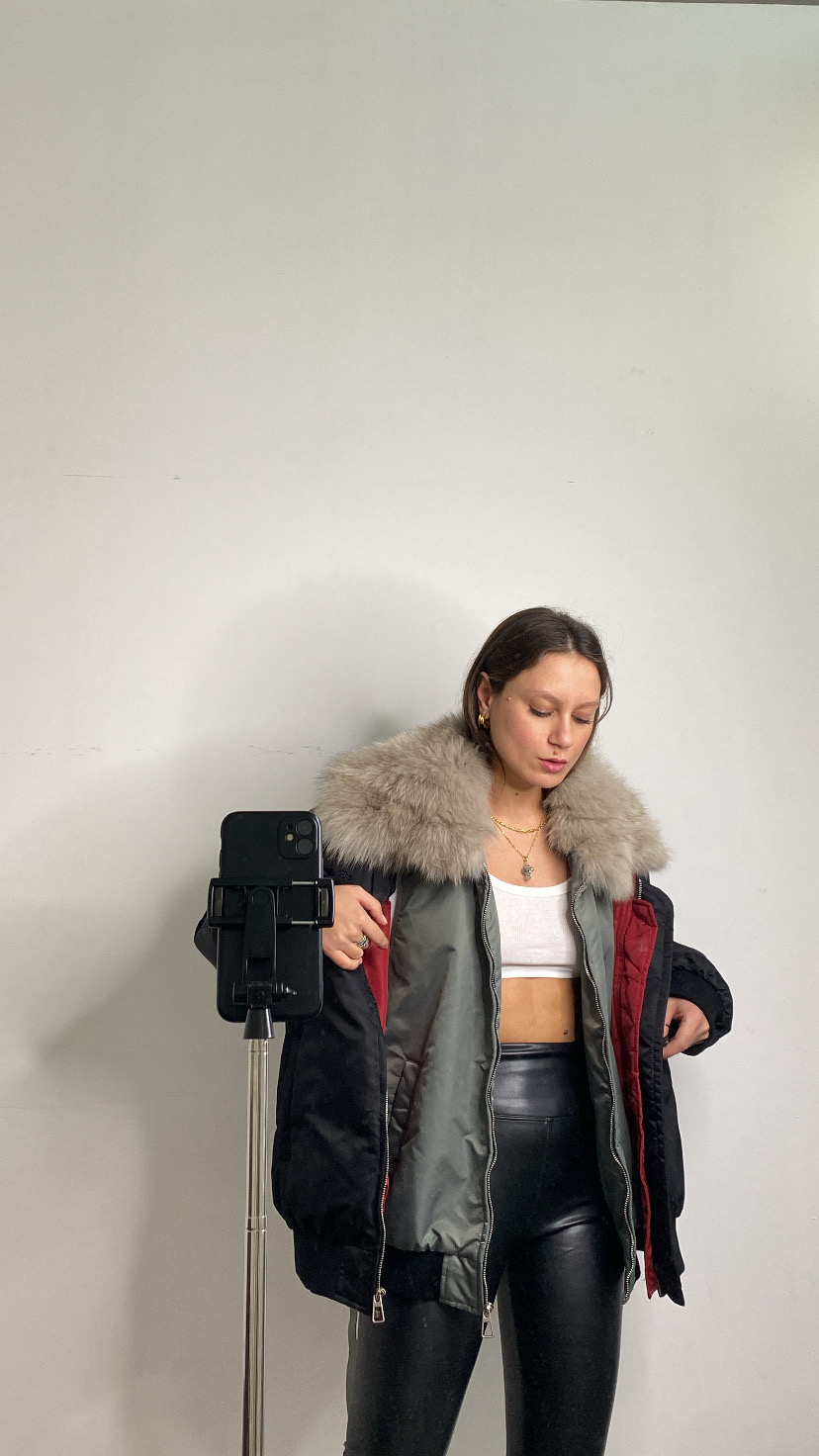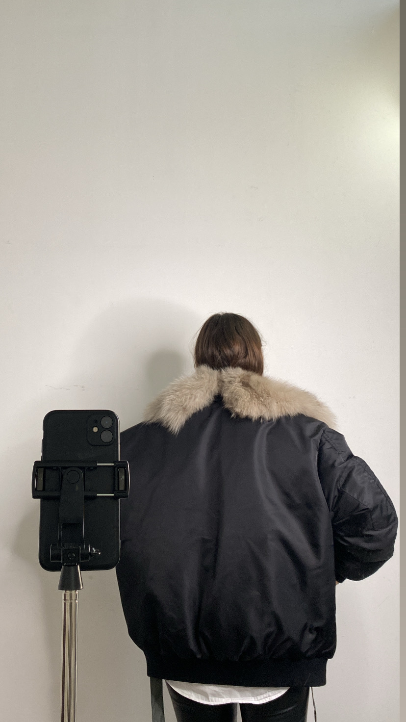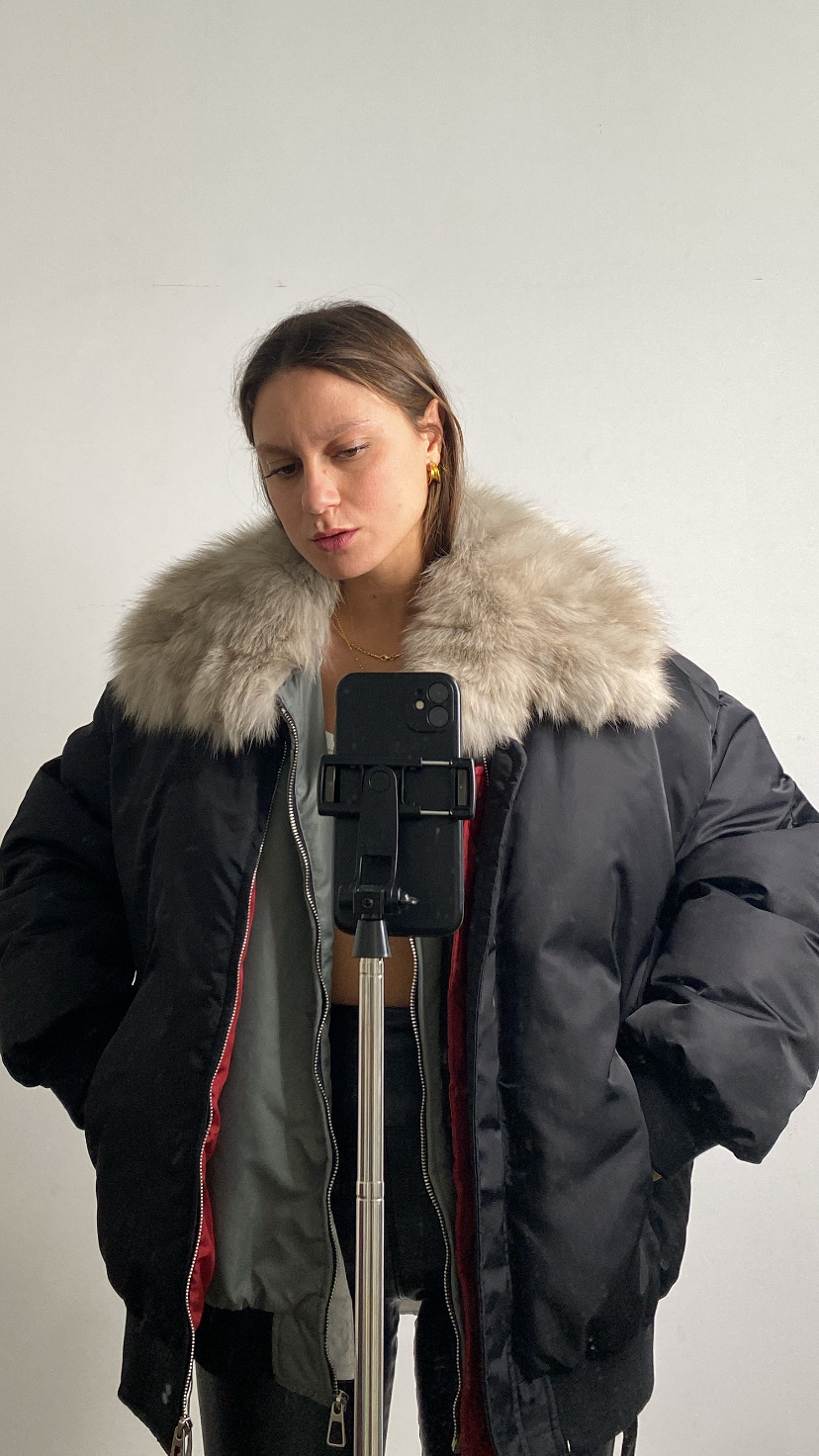 Bomber imbottito in piuma d’oca foderato all’interno con gilet rimovibile all’interno che riporta in vista il collo di pelliccia vera anch’essa rimovibile chiusura con zip avanti tasche laterali polsino sul fondo della manica e all’orlo 36/50 oversize