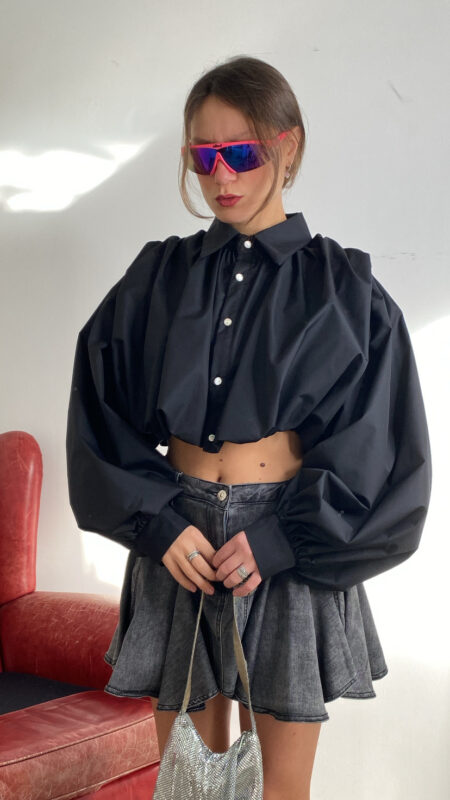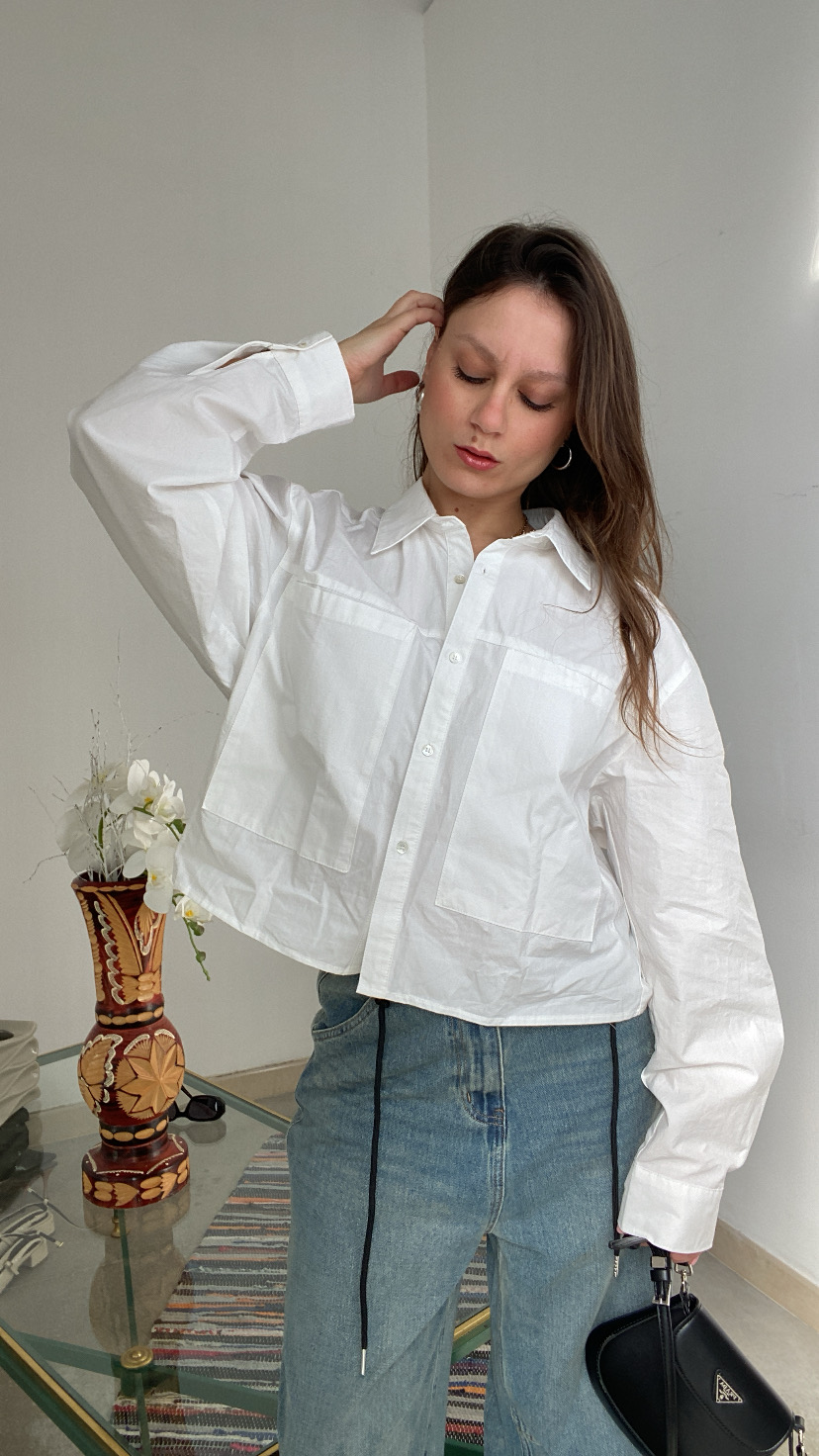 Camicia bianca di media lunghezza con bottoni avanti e orlo delle maniche tasche grandi frontali oversize 36/44 italiana