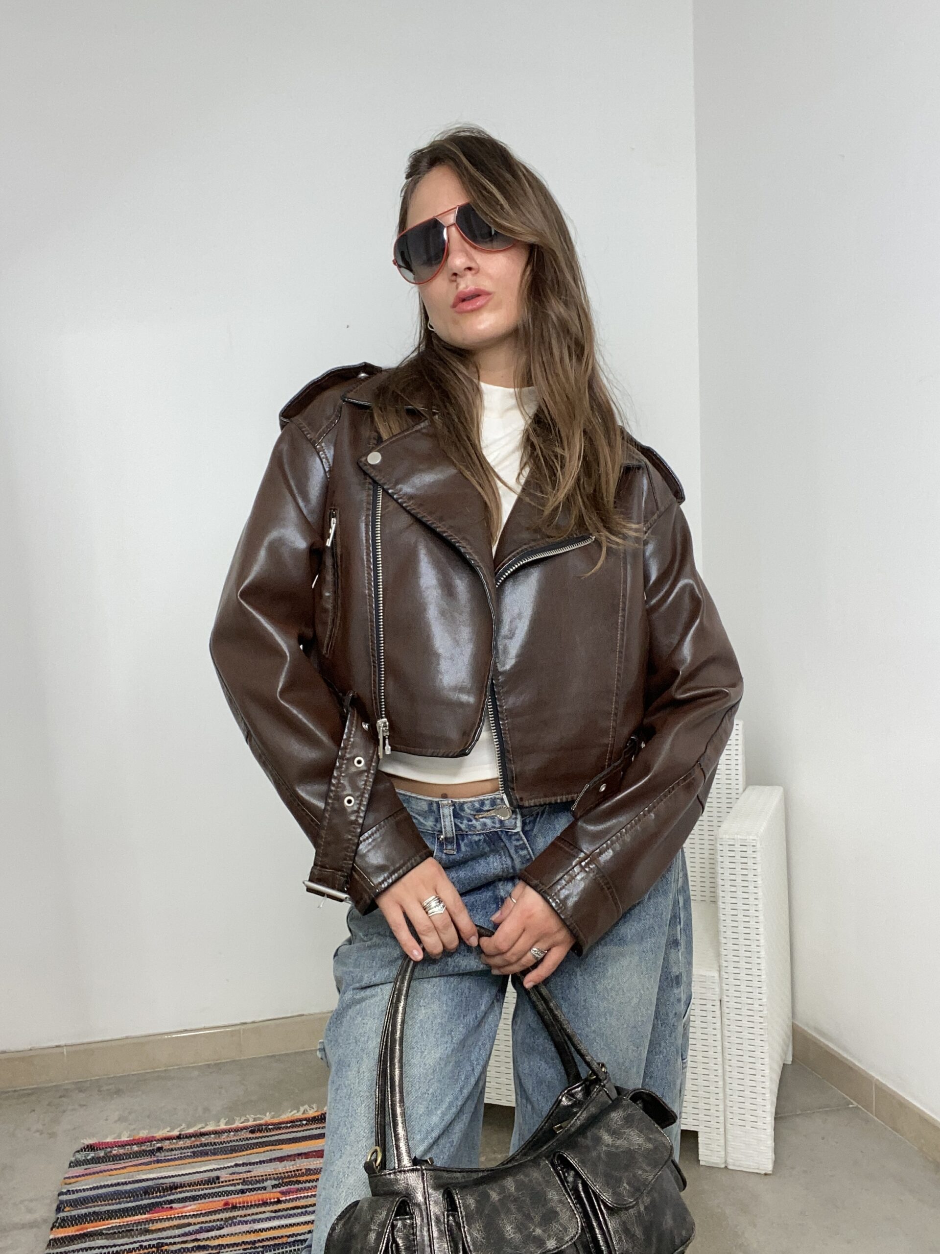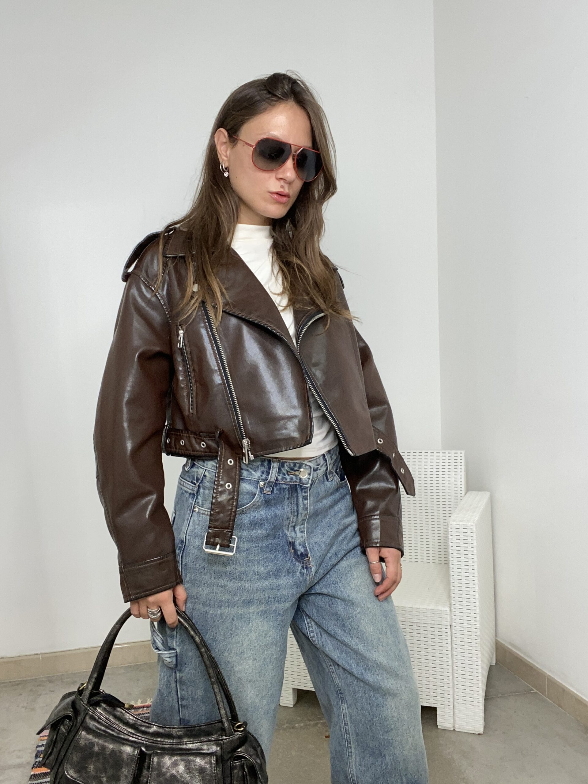 Chiodo ecopelle marrone cintura incorporata zip sul davanti tasche laterali