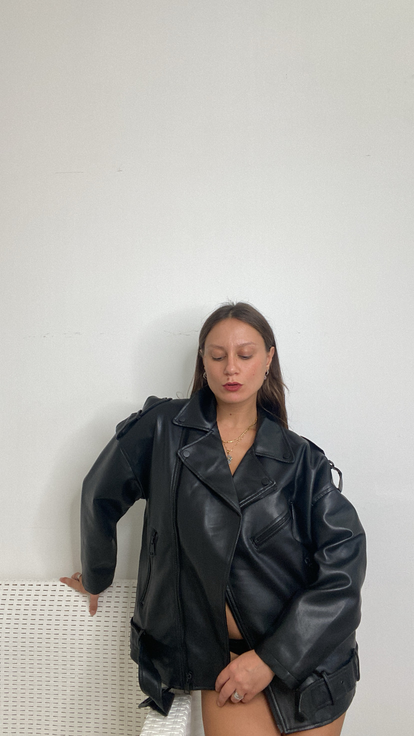 Chiodo ecopelle over chiusura a vista colori tono su tono colletto rever cintura incorporata tasche laterali con chiusura lampo