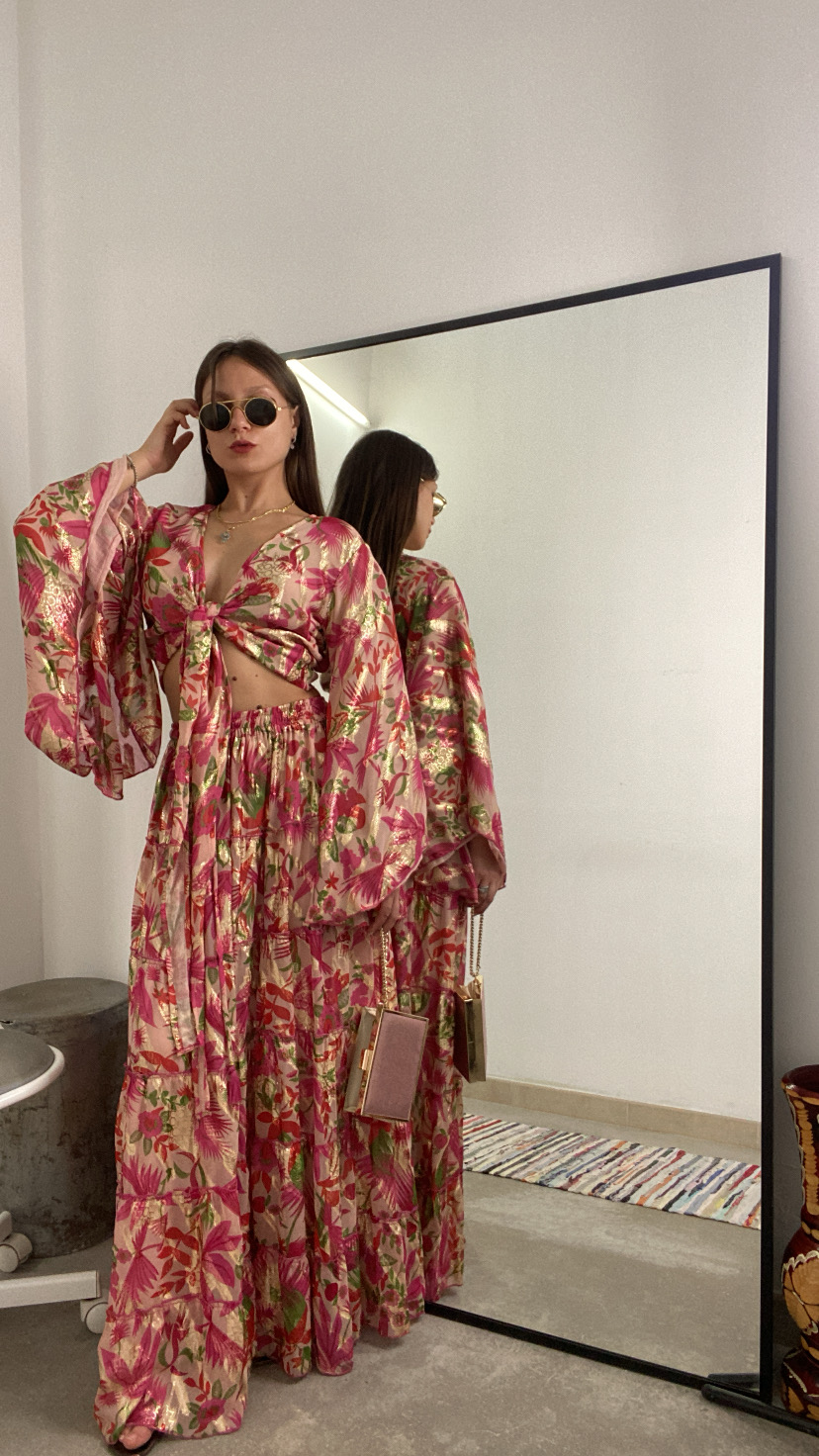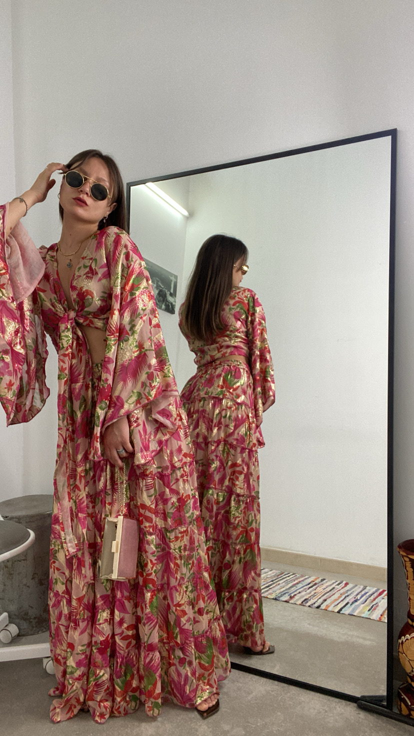 Coordinato maglia e gonna lunga in fantasia etnica, elastico