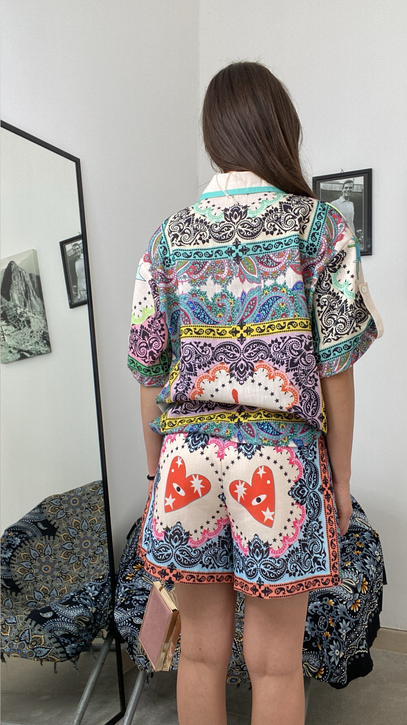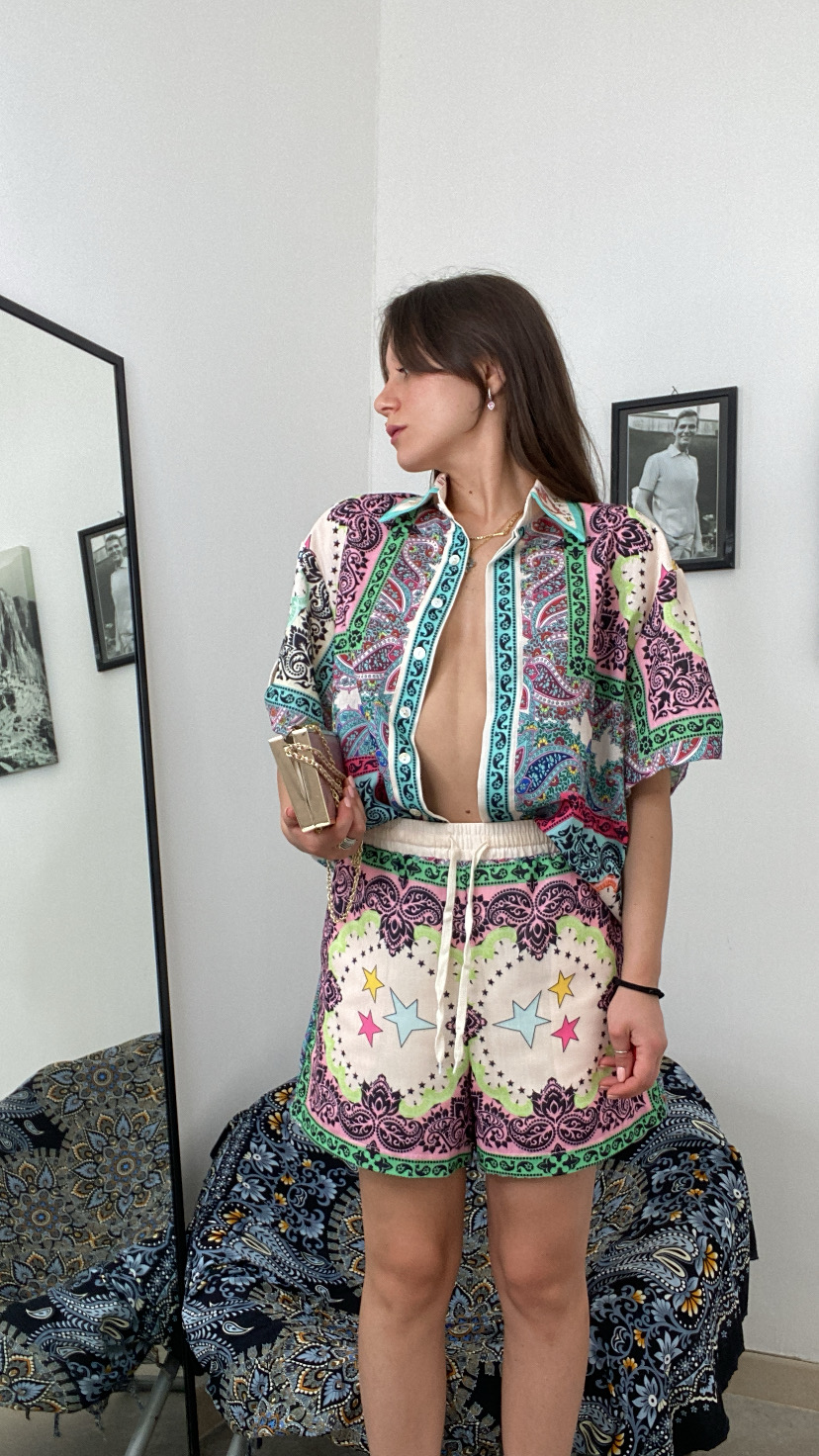 Coordinato composto da camicia e shorts a fantasia multi color, elastico e coulisse in vita. Misto cotone