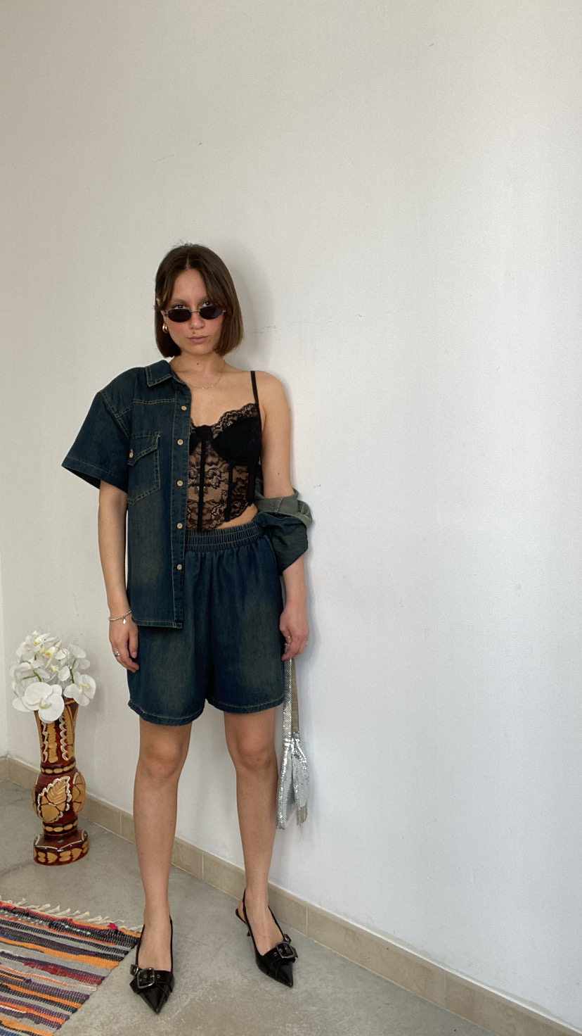 Coordinato in jeans con sfumature e cuciture a contrasto camicia serie di bottoni avanti tasche laterali con patta fit regolare il bermuda presenta l’elastico sul cinto tasca a filo laterale gamba larga 36/44 italiana