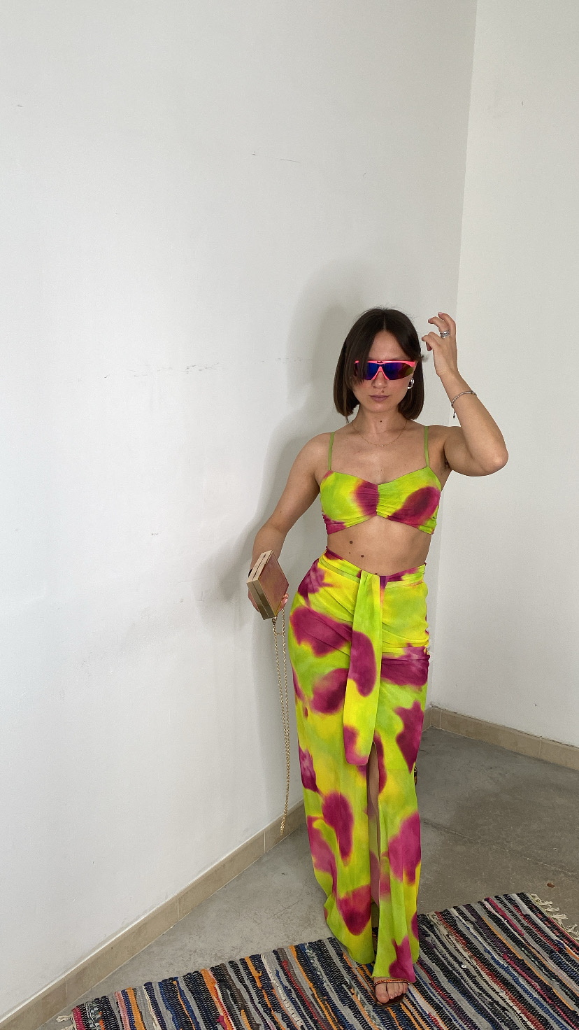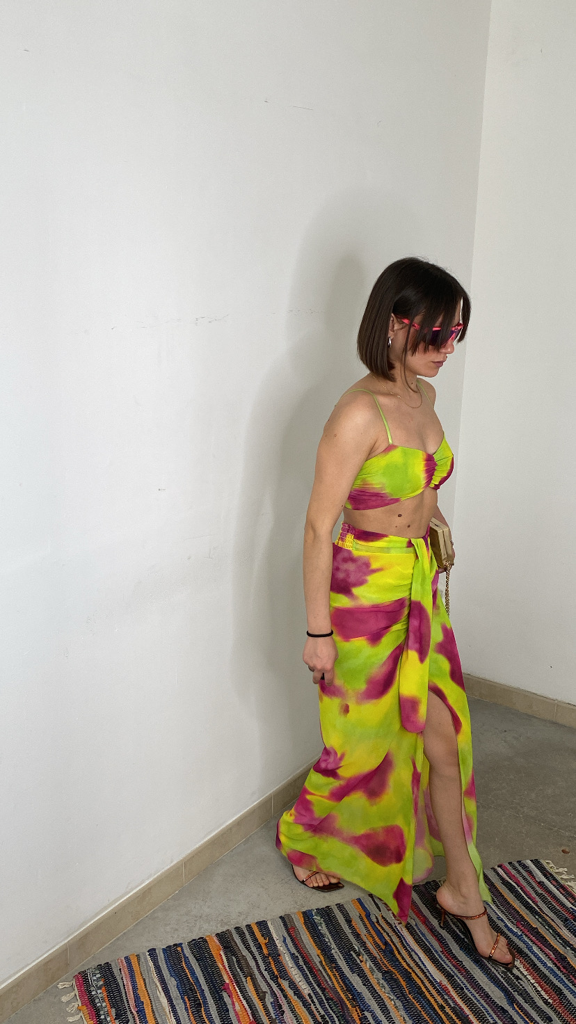 Top bretelle regolabili elastico sul retro coppe preformate gonna a vita alta con medio strascico avanti spacco frontale tessuto tulle trasparente parte interessata foderata elastico sul retro 38/44 italiana
