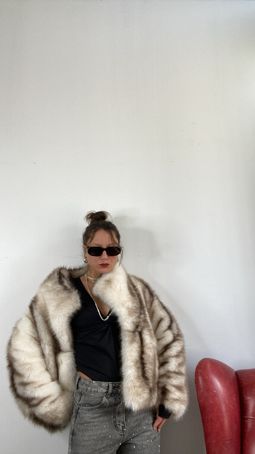 Pelliccia sintetica di media lunghezza collo a revers tasche laterali invisibili foderata all’interno chiusura con gancetto invisibile avanti oversize 36/48