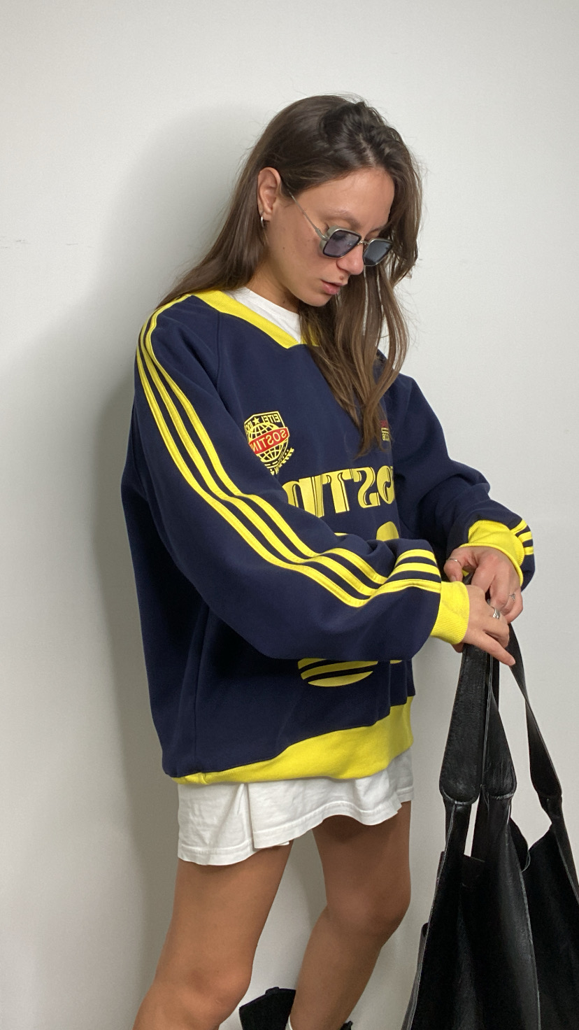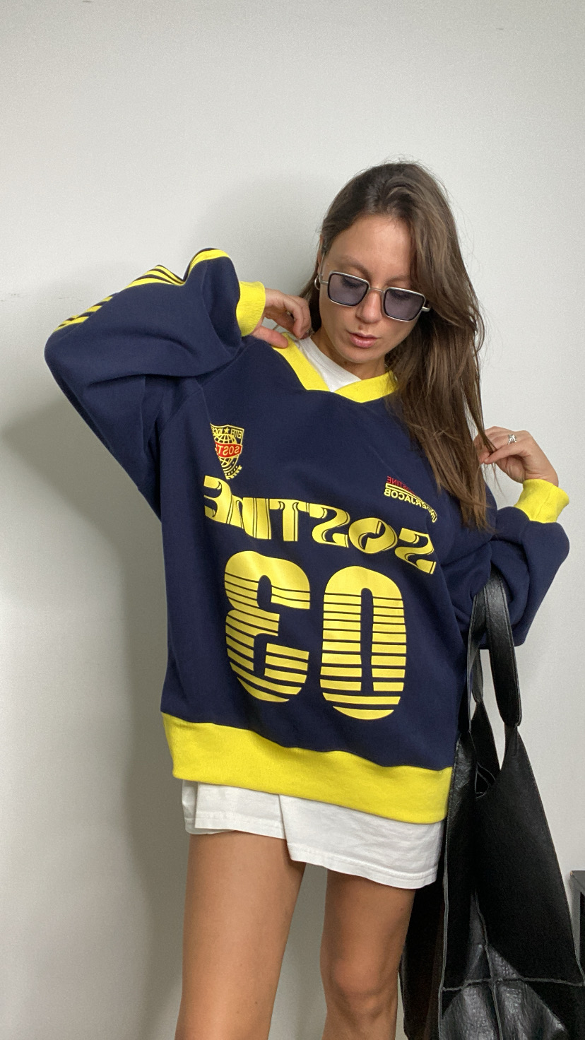 Felpa blu oversize con pile all’interno stampe a contrasto con il giallo avanti e bande alle maniche