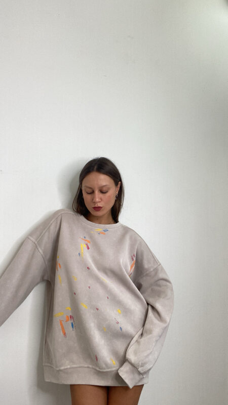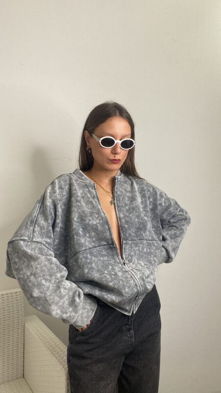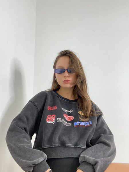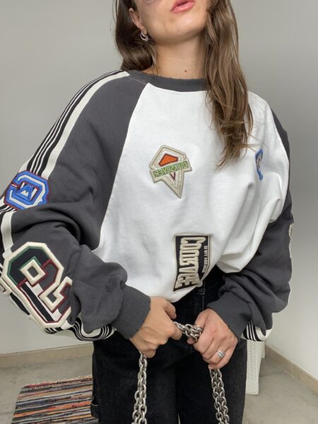 Felpa nera oversize con pile all’interno stampe a contrasto avanti e bande alle maniche elastico sul fondo