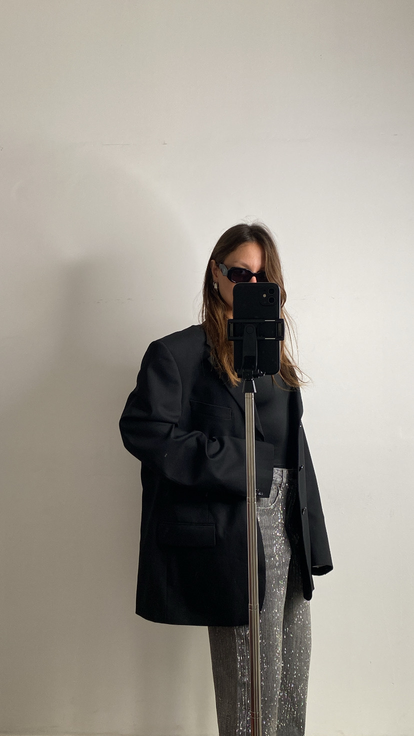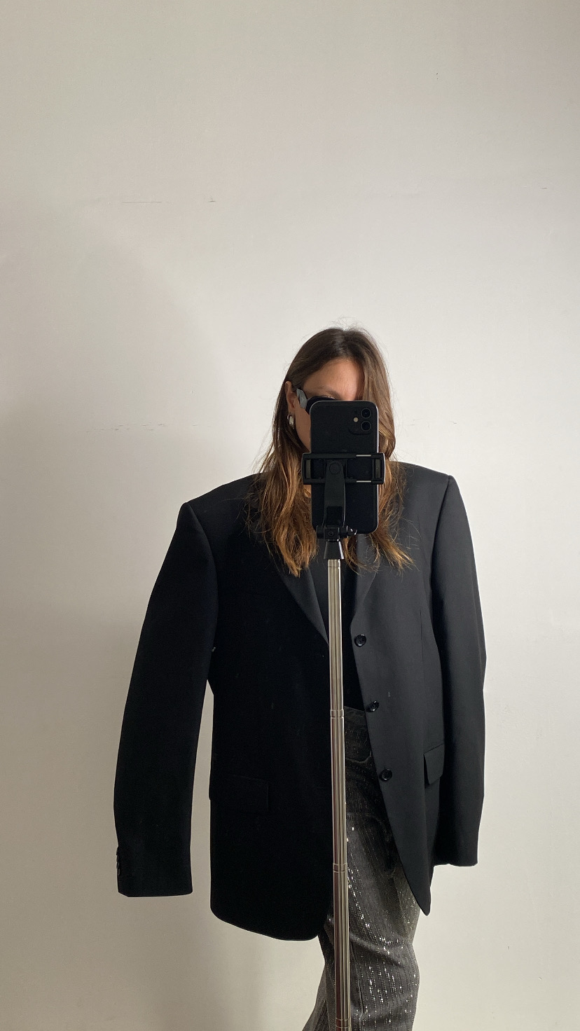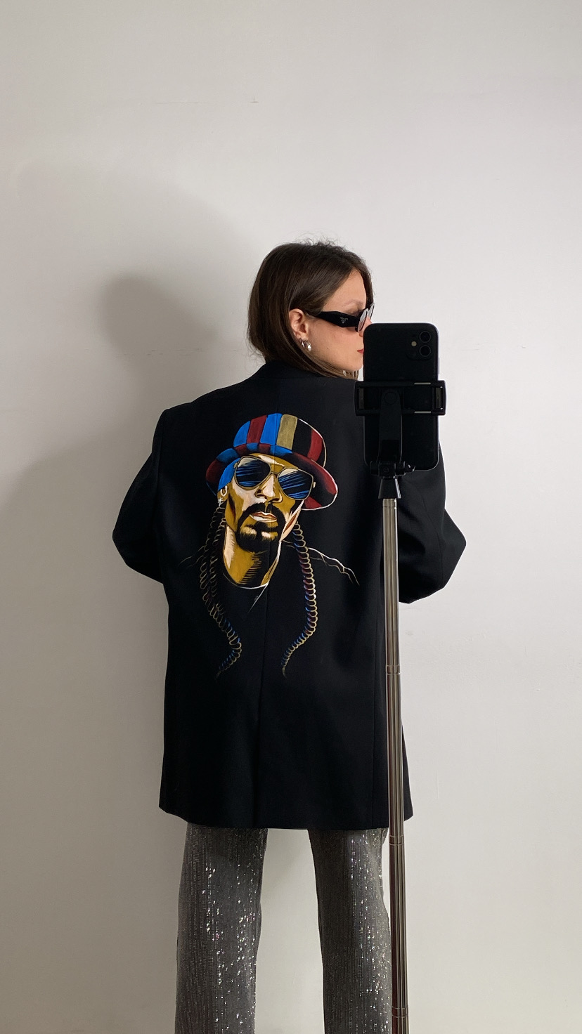 Giacca oversize con spalline sugli omeri bottoni avanti tasche con patta laterali disegno dipinto a mano sul retro di Snoop Dogg 36/48