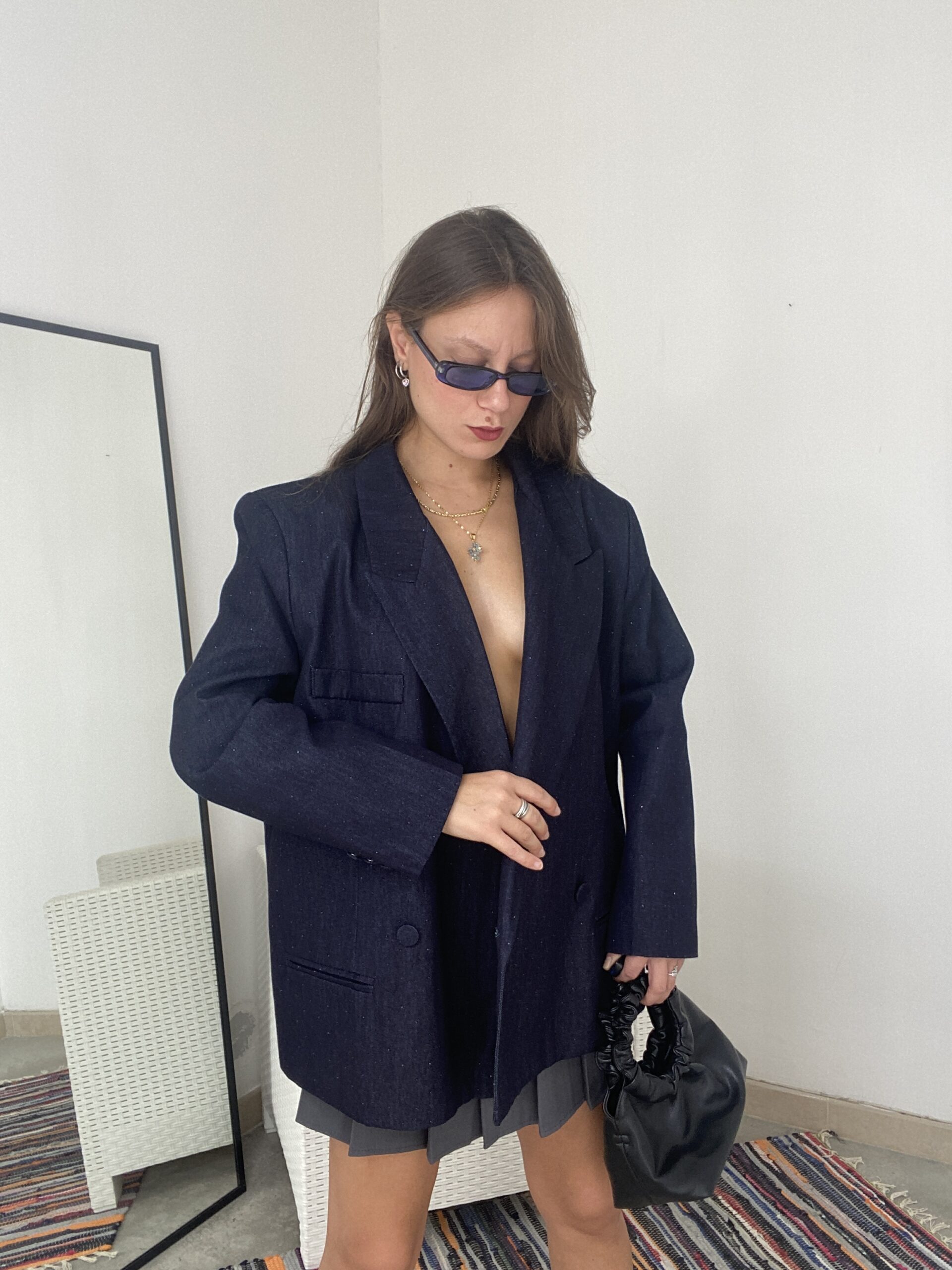 Giacca in jeans doppio petto oversize con spalline completa di brillantini