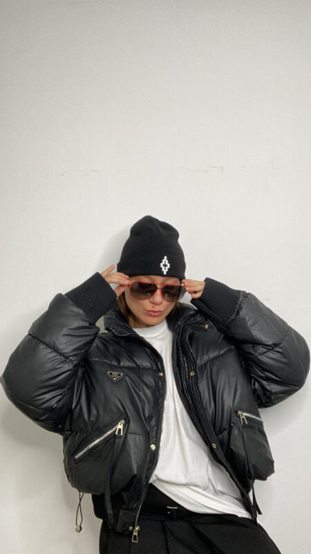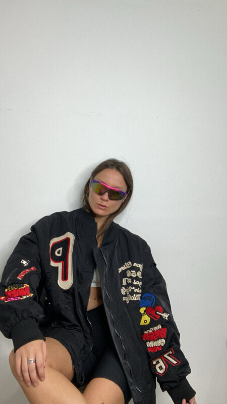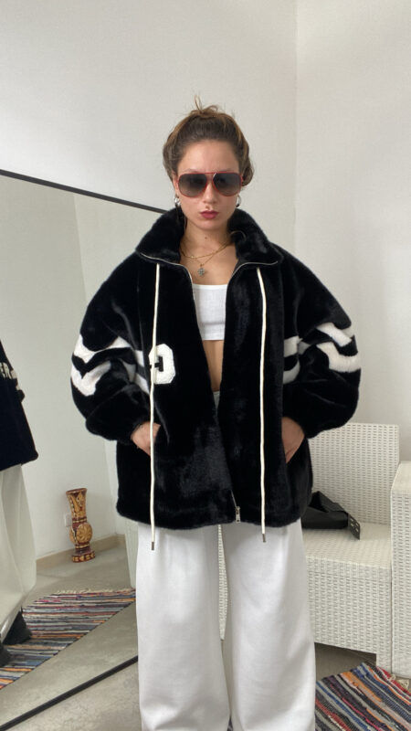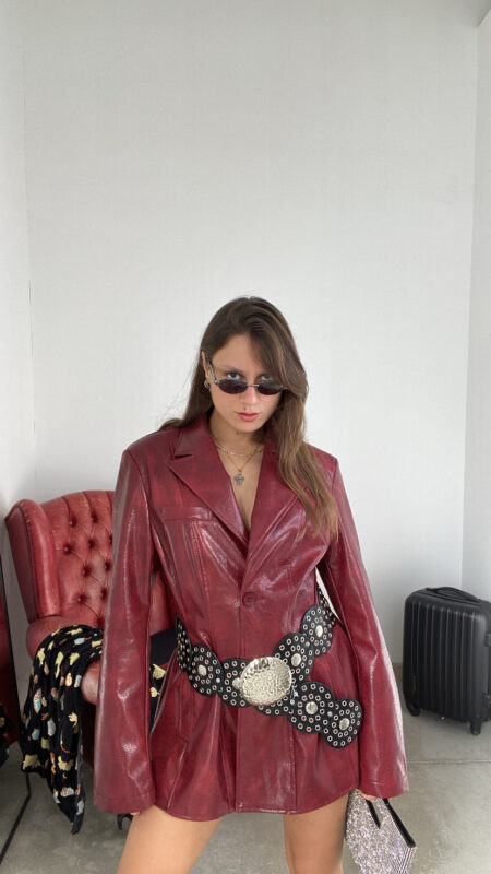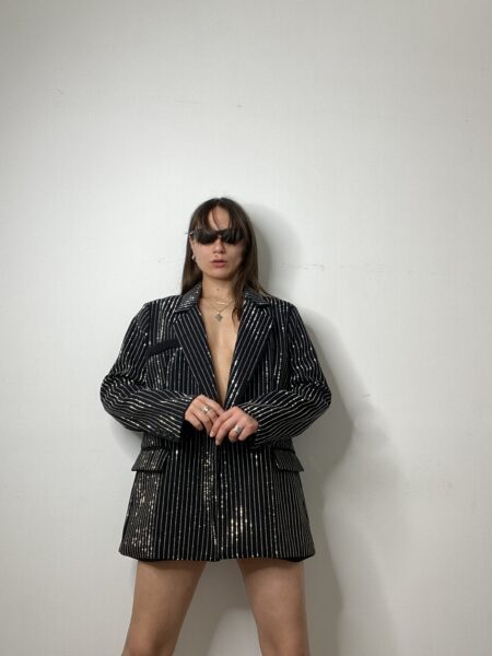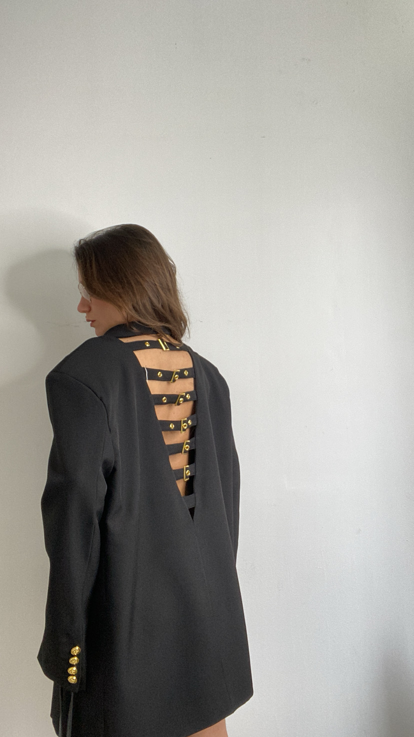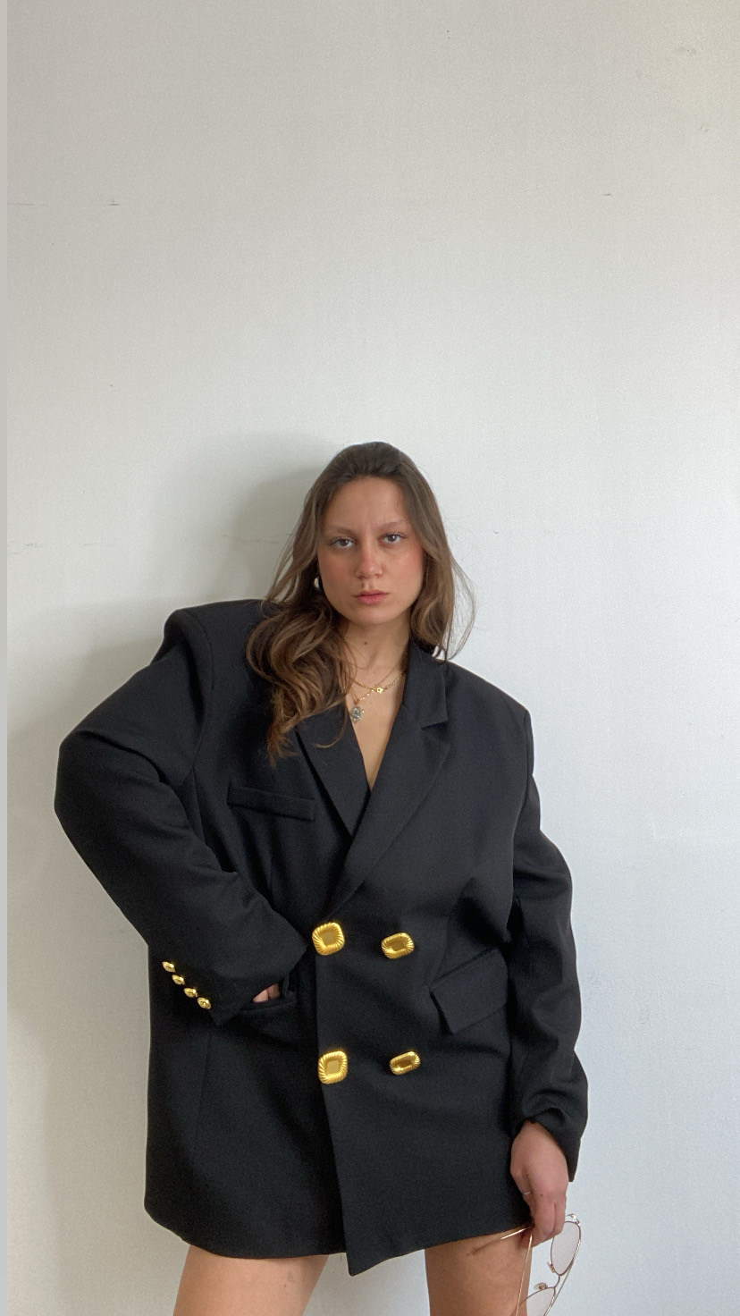 Giacca a doppio petto over collo a revers spalline sugli omeri tasche laterali con patta bottoni color oro avantinr sul fondo delle maniche schiena scoperta accompagnata da finte fibbie dorate 36/46 italiana