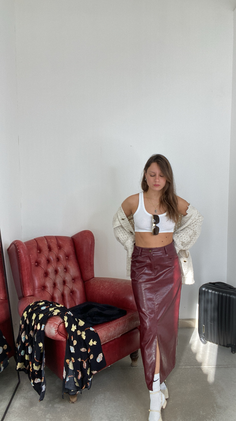 Gonna lunga a vita alta in ecopelle bordeaux con lieve spacco sul fondo