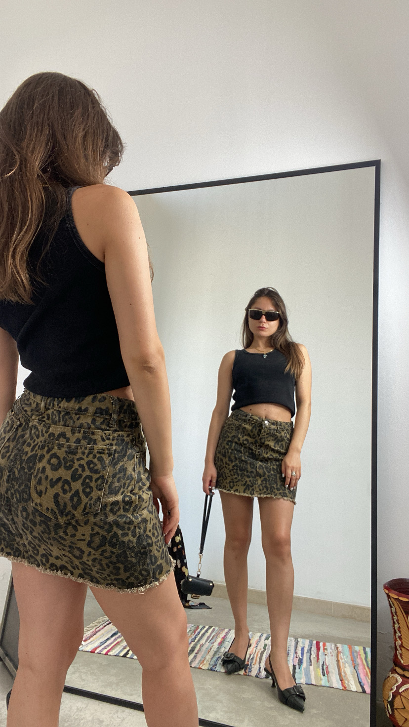Gonna in fantasia animalier, rivestita da shorts al suo interno, sfrangiata sul fondo