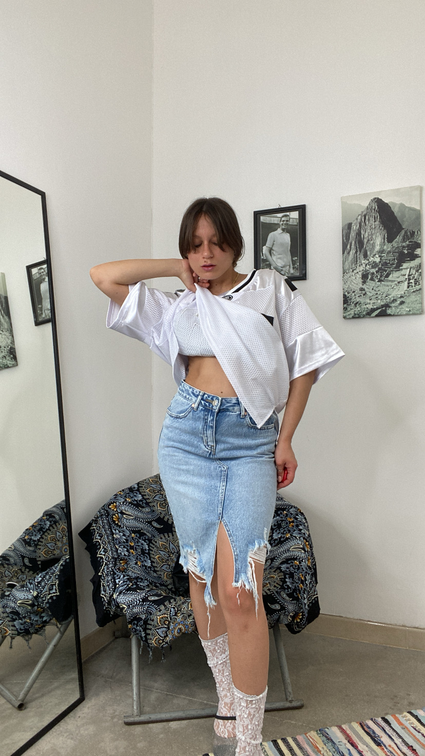 Gonna longuette in jeans a vita alta con spacco e strappi sul fondo