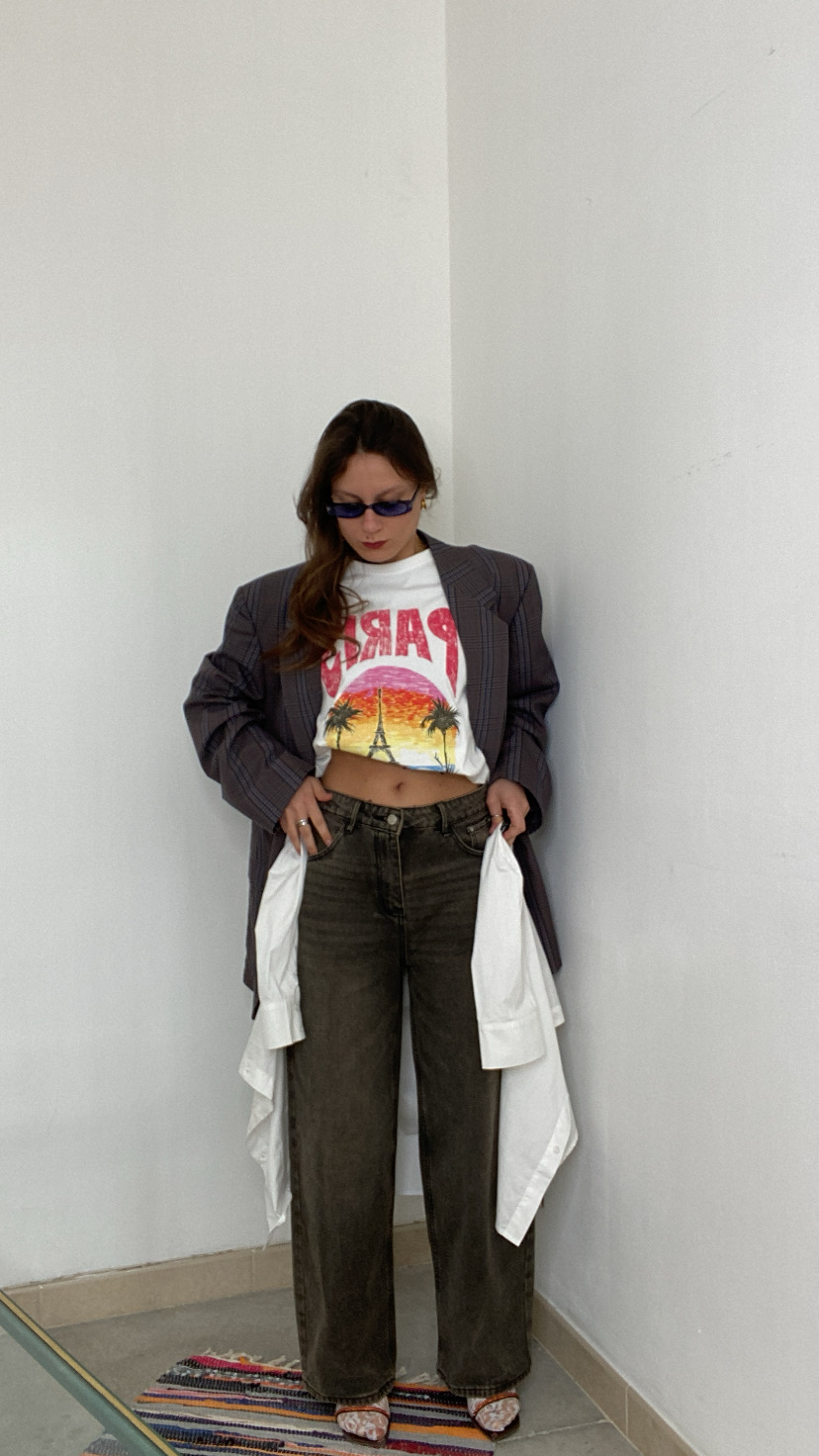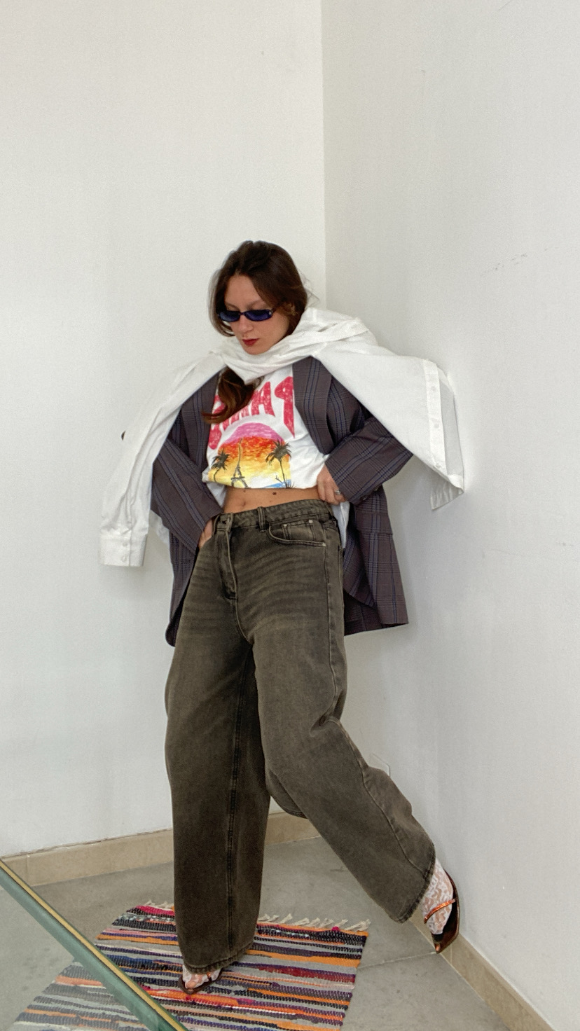 Jeans lavaggio medio invecchiato a vita media gamba larga tela fissa