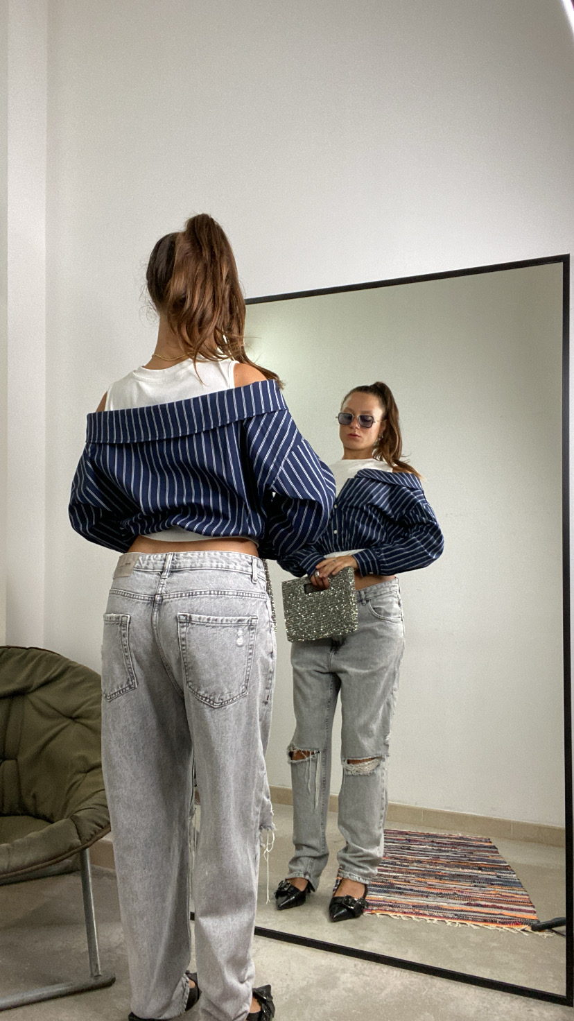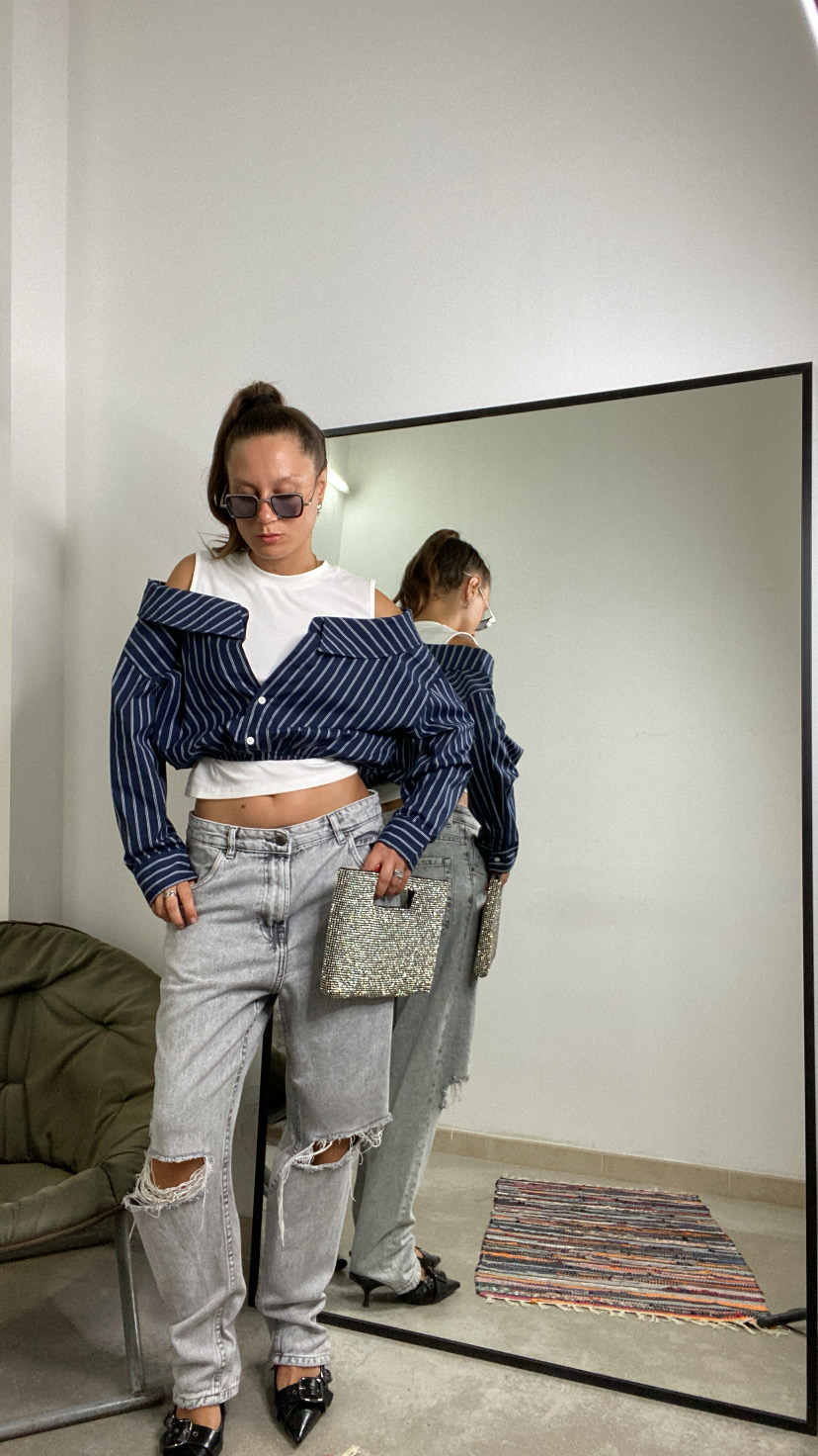 Jeans lavaggio grigio consumato alle ginocchia vita bassa largo