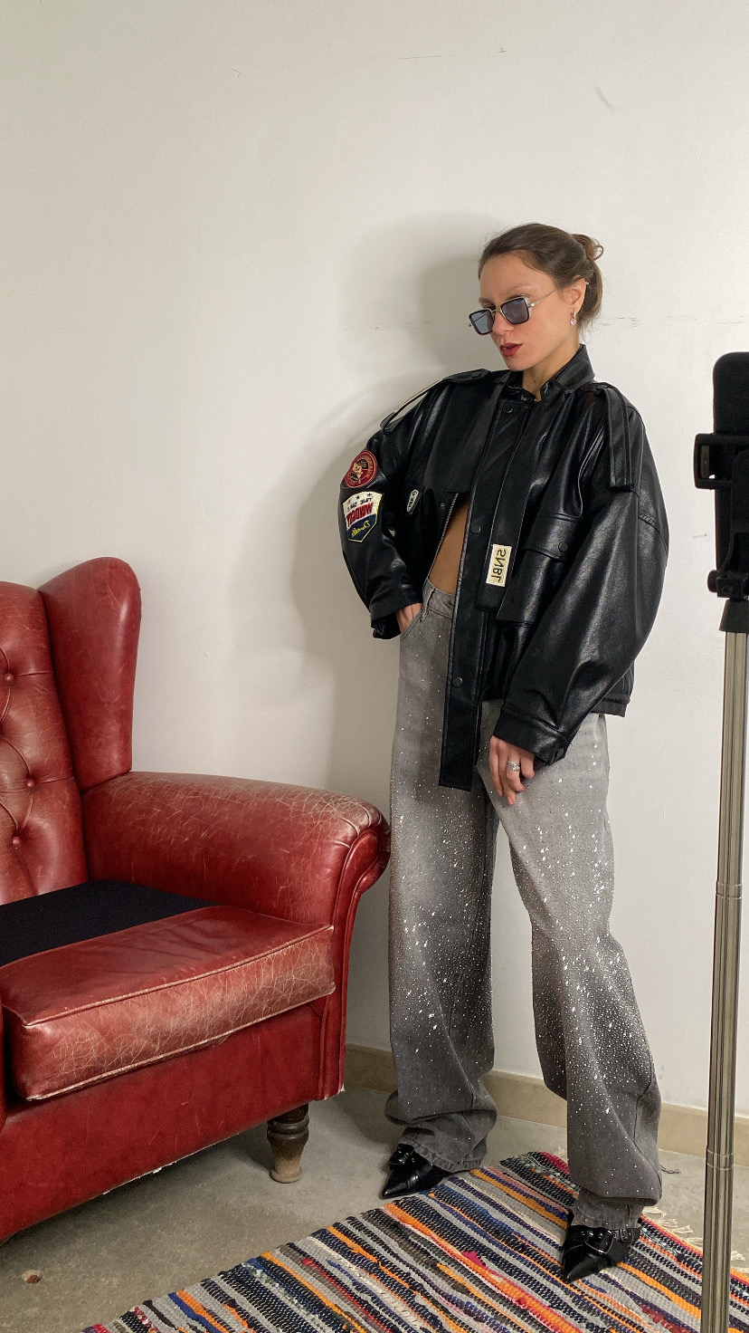 Jeans baggy lavaggio grigio chiaro completo di brillantini vita media gamba larga tela fissa