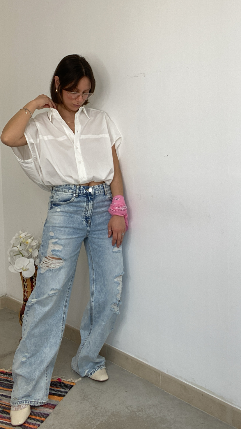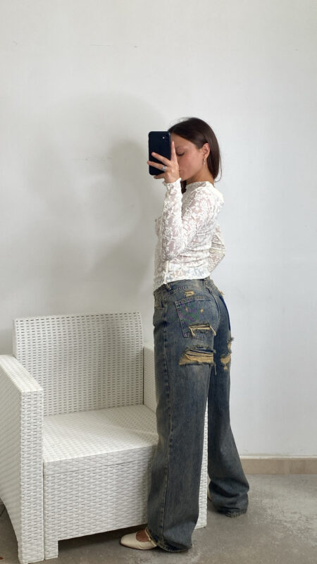 Jeans lavaggio chiaro a vita alta gamba dritta tela fissa effetto consumato