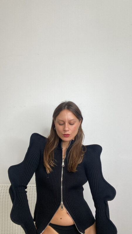 Maglia con scollatura avanti chiusura frontale a corsetto maniche velate con bottone sul fondo parte interessata foderata