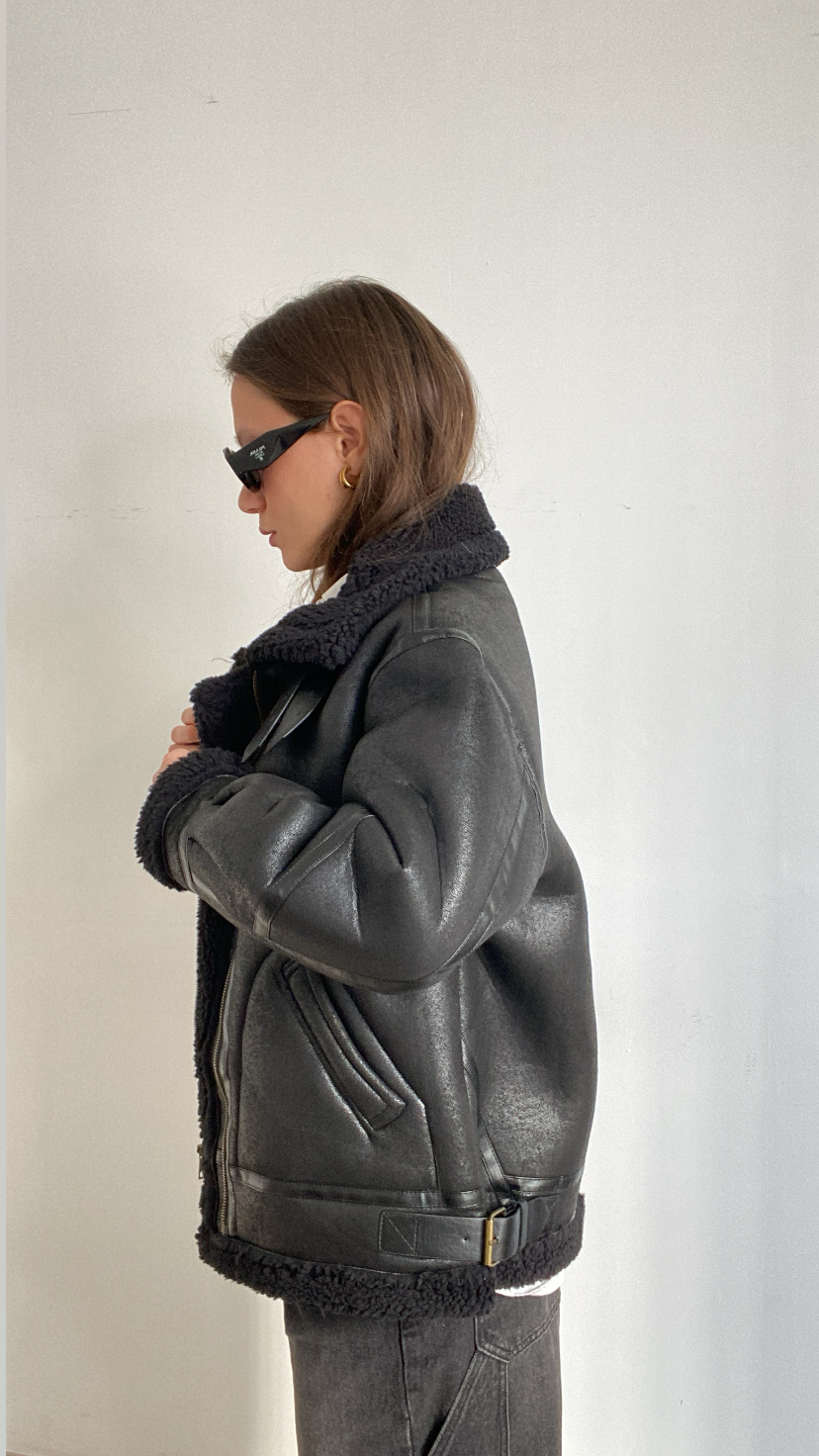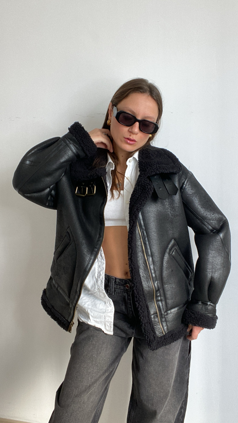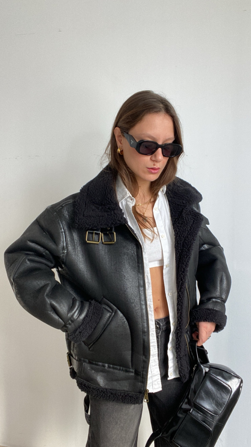 Montone ecopelle all’esterno combinato all’interno da pelliccia sintetica di colore stesso collo a revers con doppio cinturino a contrasto chiusura frontale tasche laterali 36/46 over