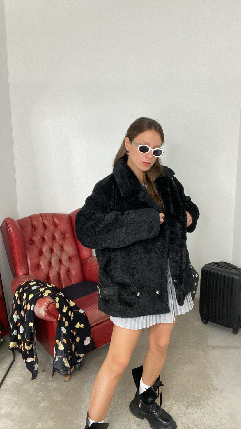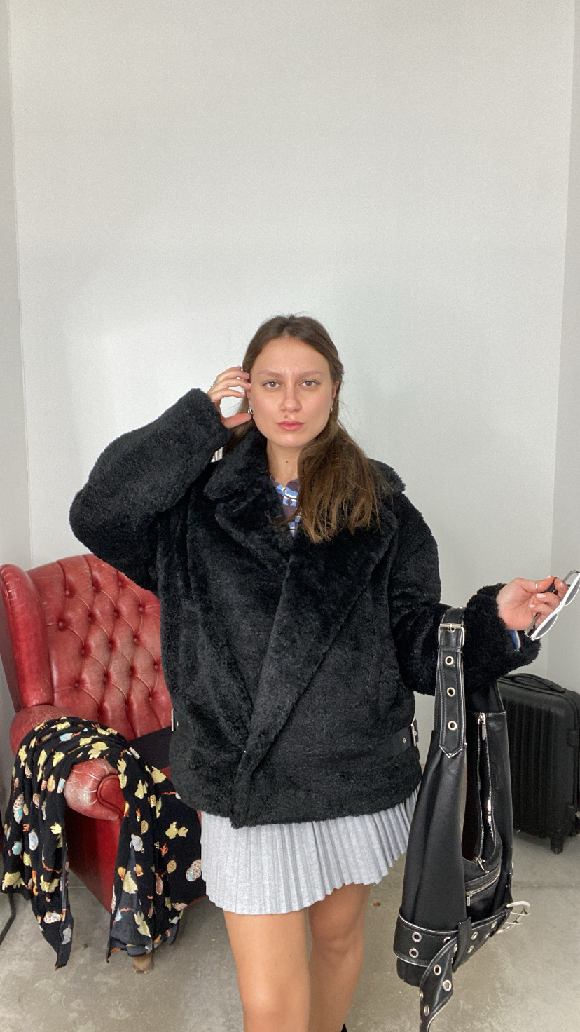 Montone sintetico collo a revers foderato all’interno con chiusura in basso di unico bottone a clip fit regolare tasche laterali 36/46