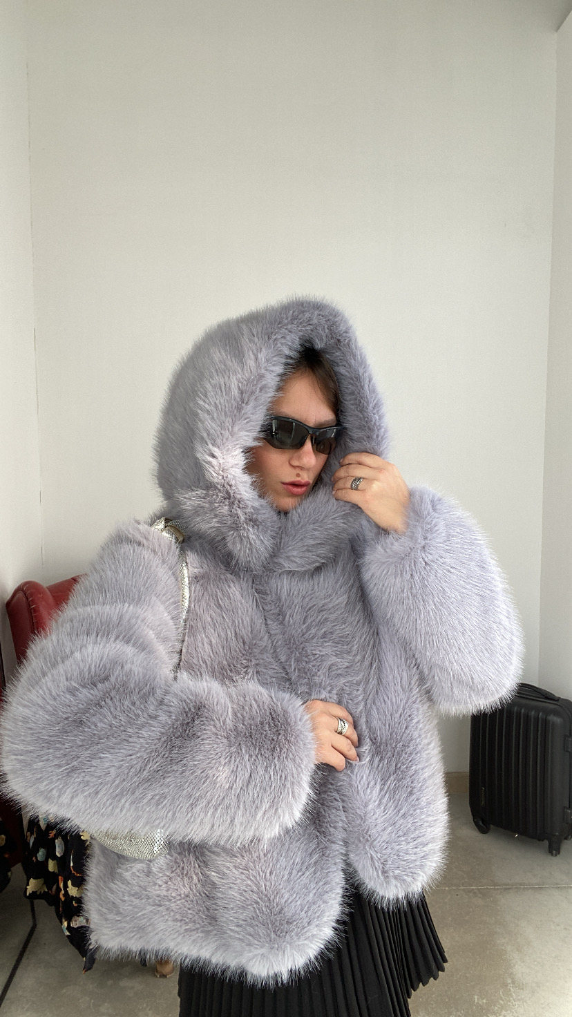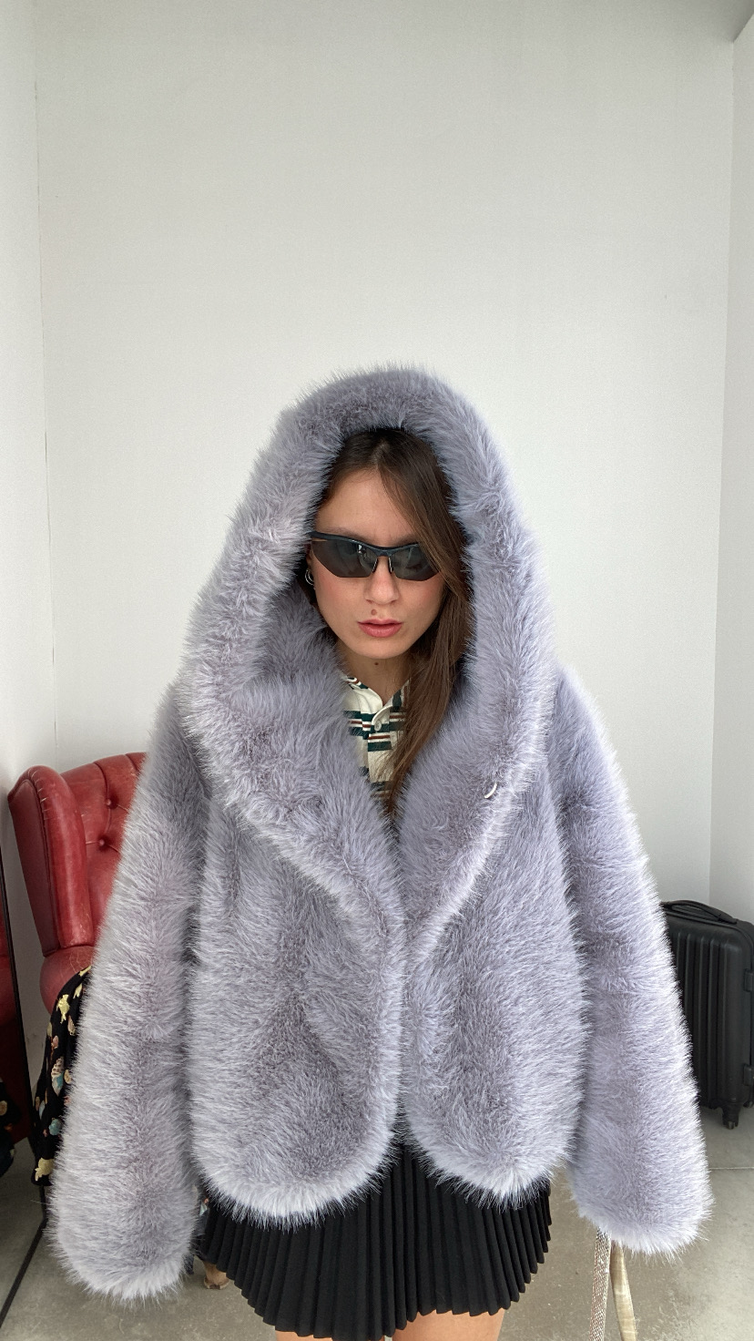 Eco pelliccia corta con cappuccio oversize tasche laterali invisibili con unico bottone frontale 36/48