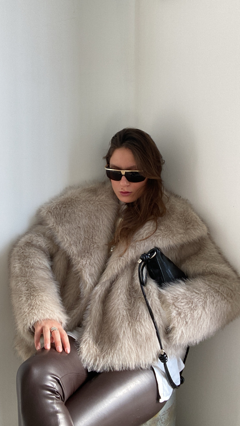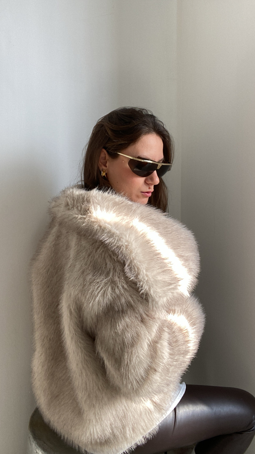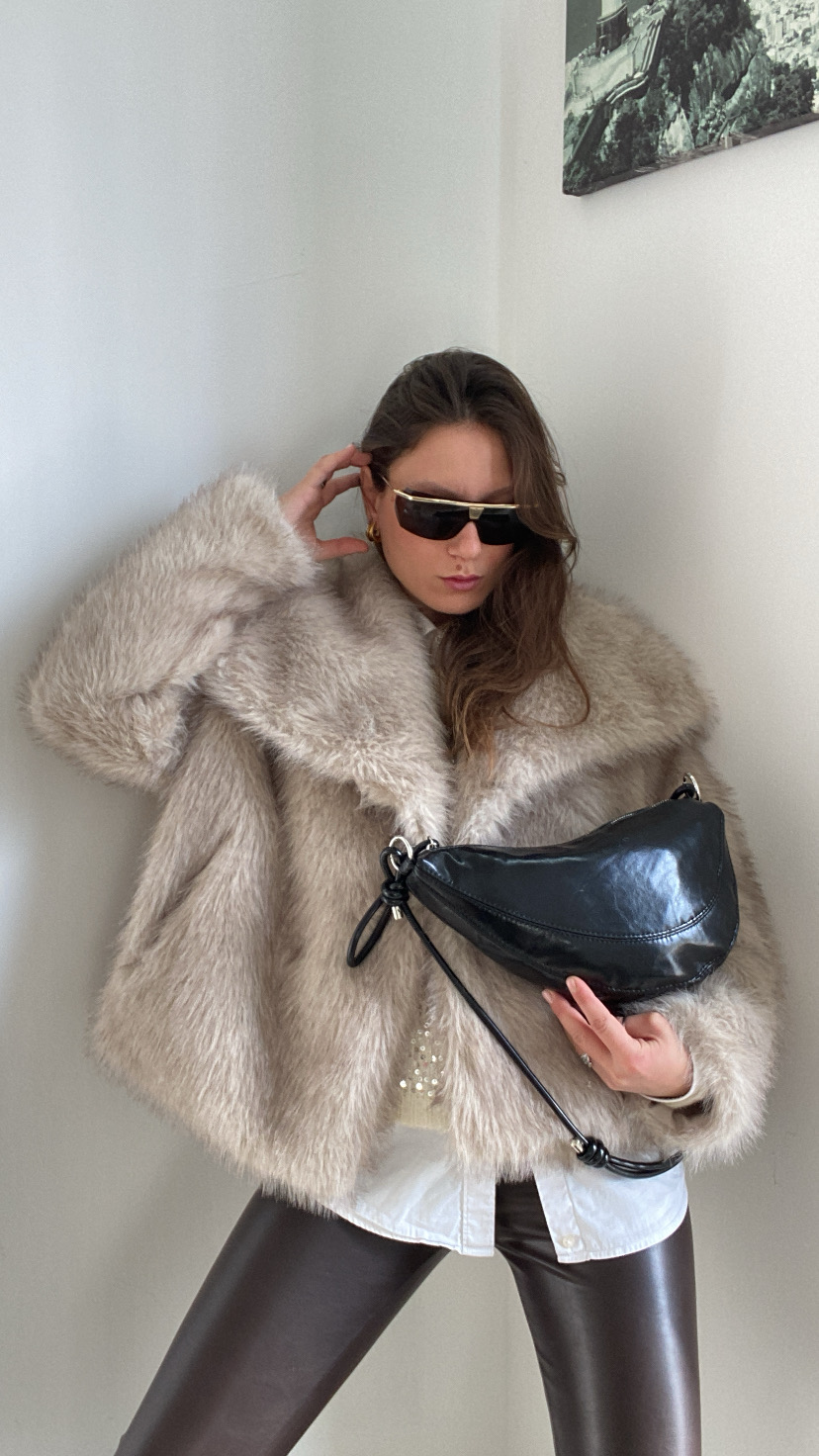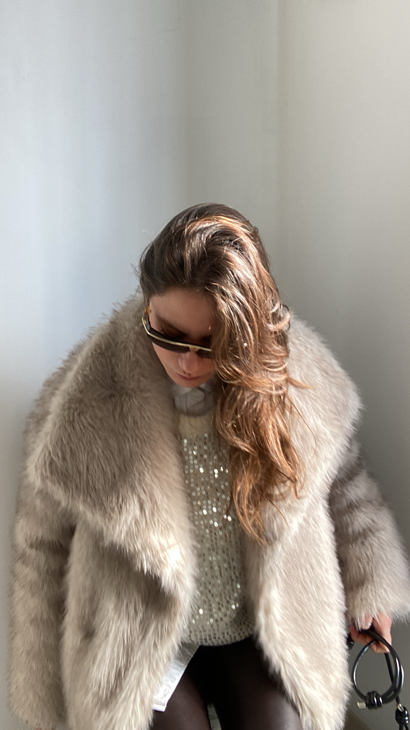 Eco pelliccia mega collo avvolgente con bottoni a clip avanti coperti e tasche laterali maniche ampie 36/46