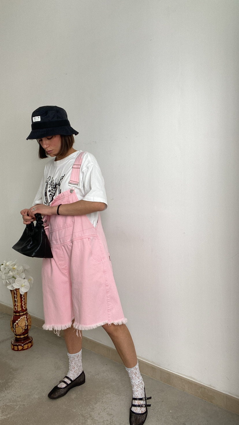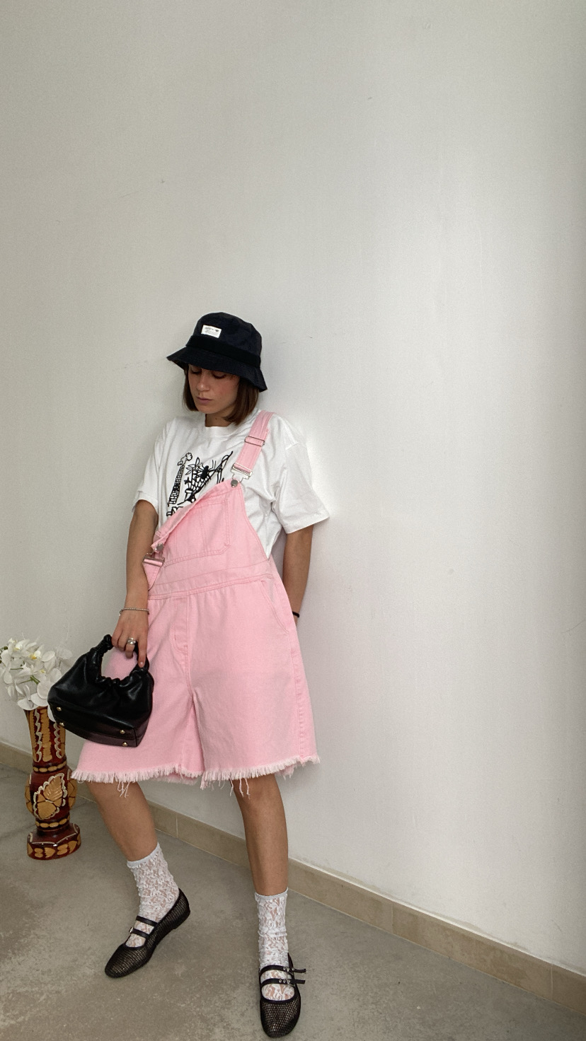 Salopette in jeans rosa bretelle regolabili gamba larga fondo sfrangiato oversize 36/48 italiana