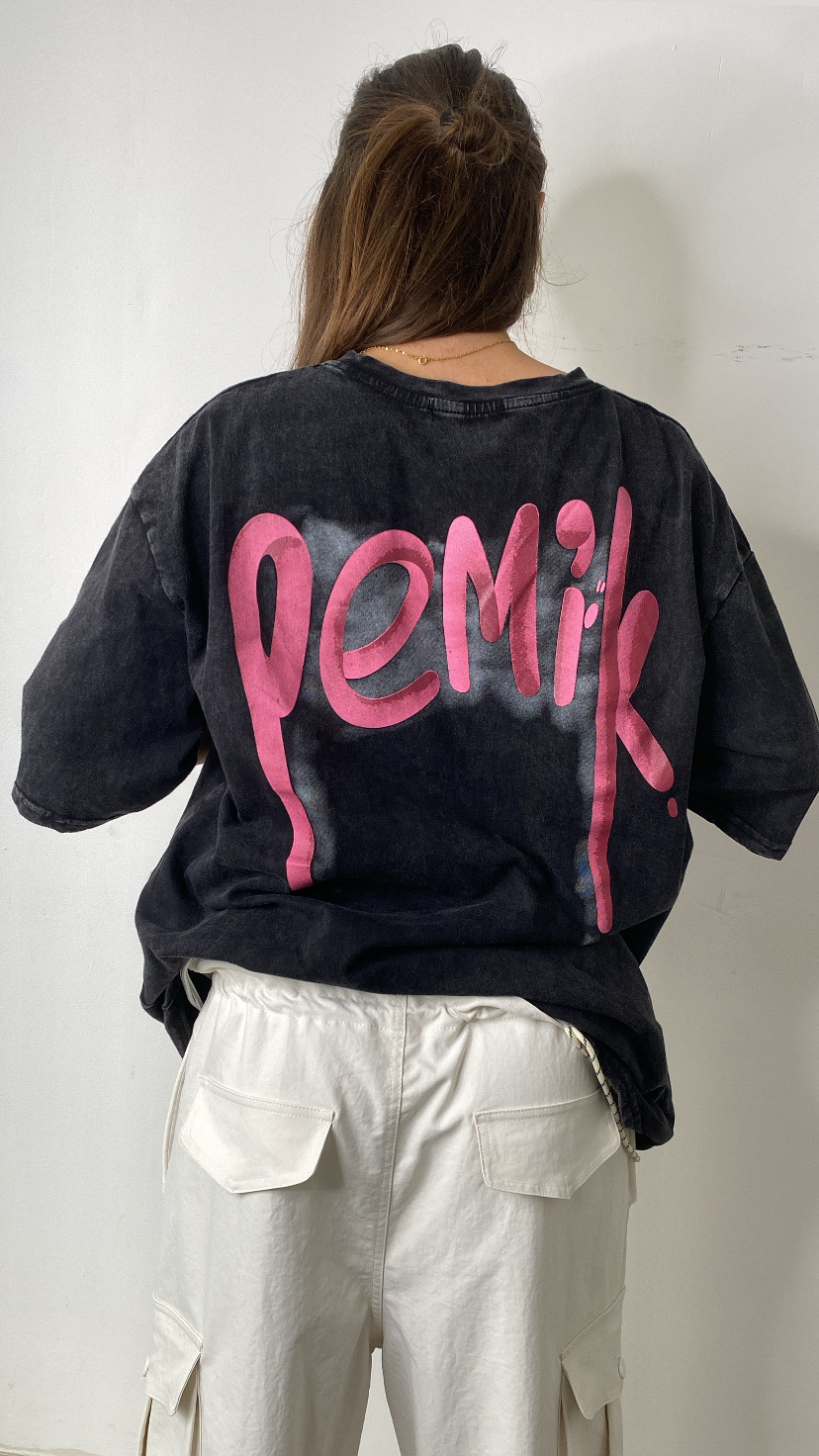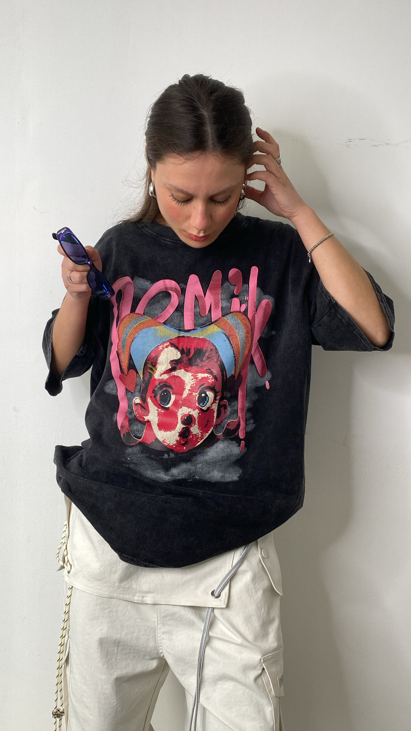 T-shirt slavata con stampa avanti colorata e scritta sul retro oversize 36/46 italiana
