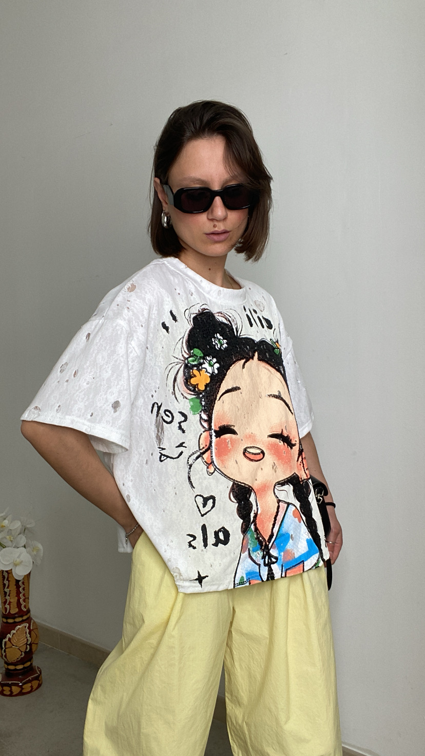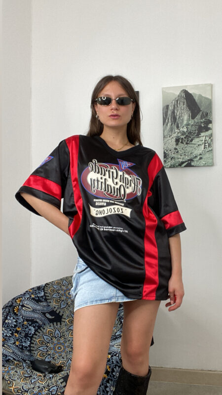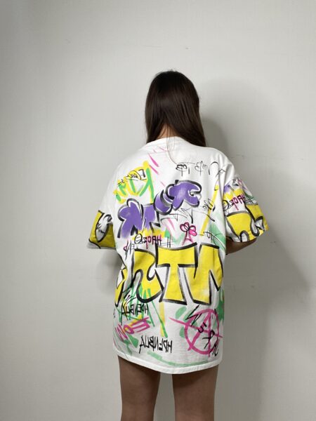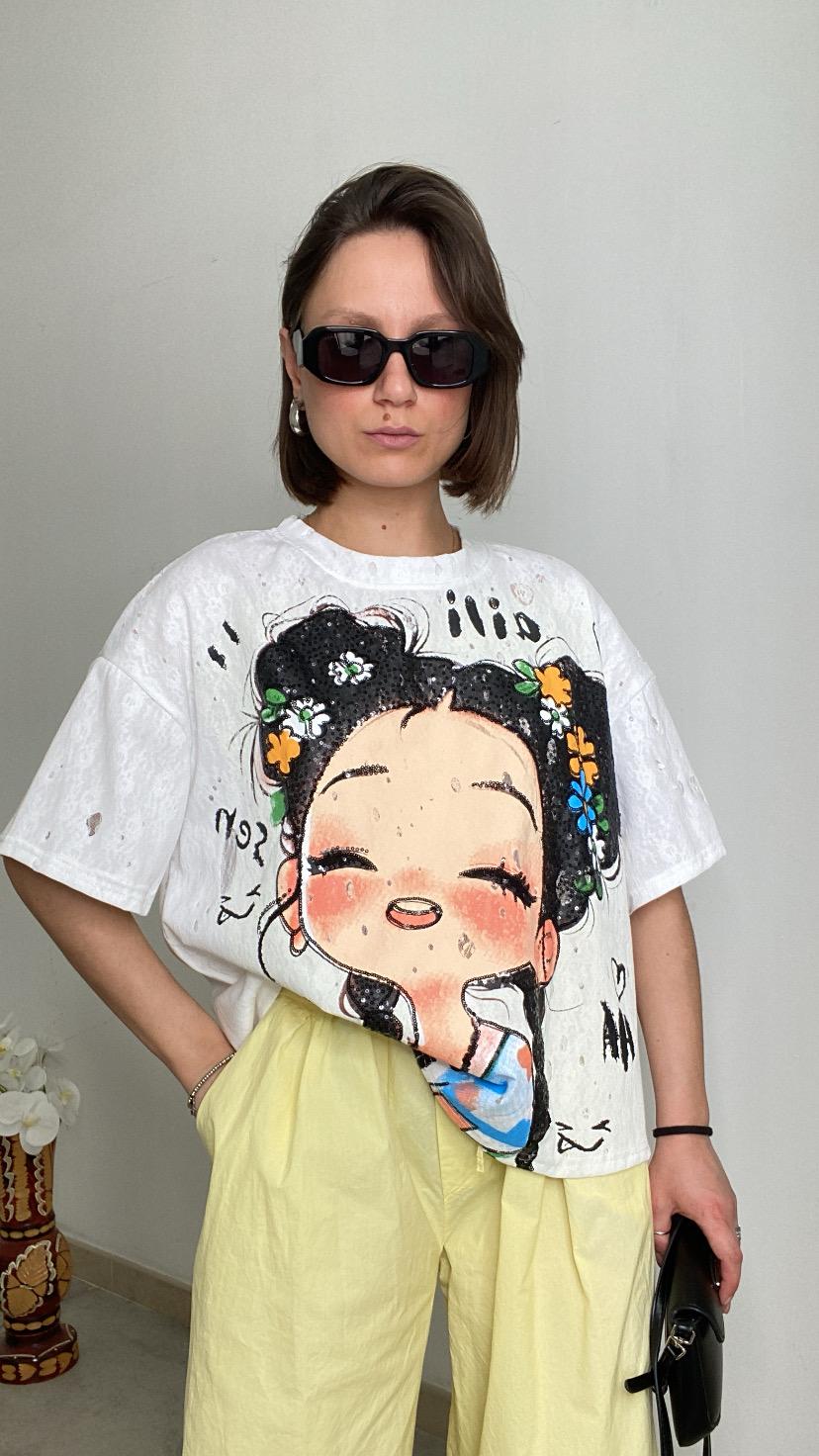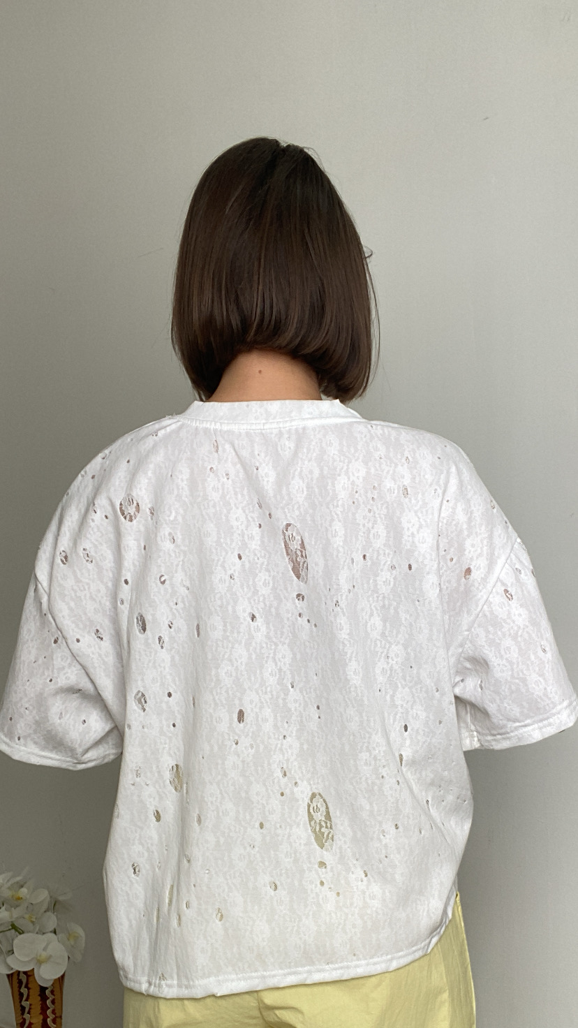 T-shirt effetto consumata con pizzo stampa avanti gommata dettagli di paillettes lunghezza media oversize 36/46 italiana