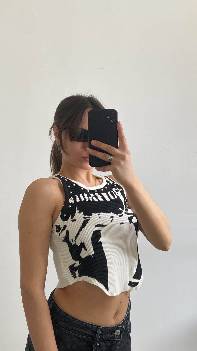 Top a costina con borchie sul davanti