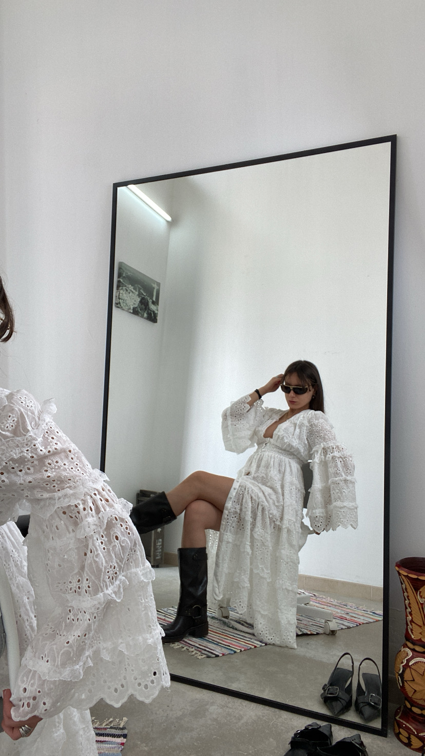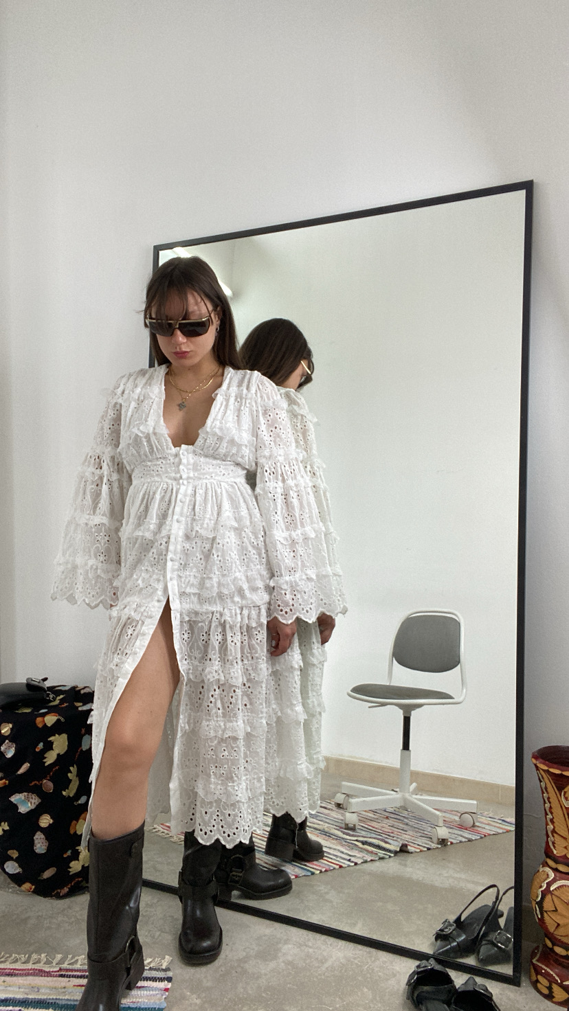 Vestito pizzo sangallo con bottoncini di tessuto stesso sul davanti, foderato al suo interno