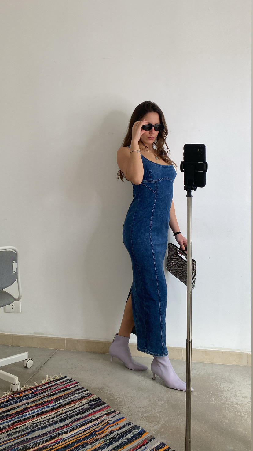 Vestito in jeans lavaggio medio aderente elastico zip con gancetto sul retro invisibile spacco medio dieto sul fondo