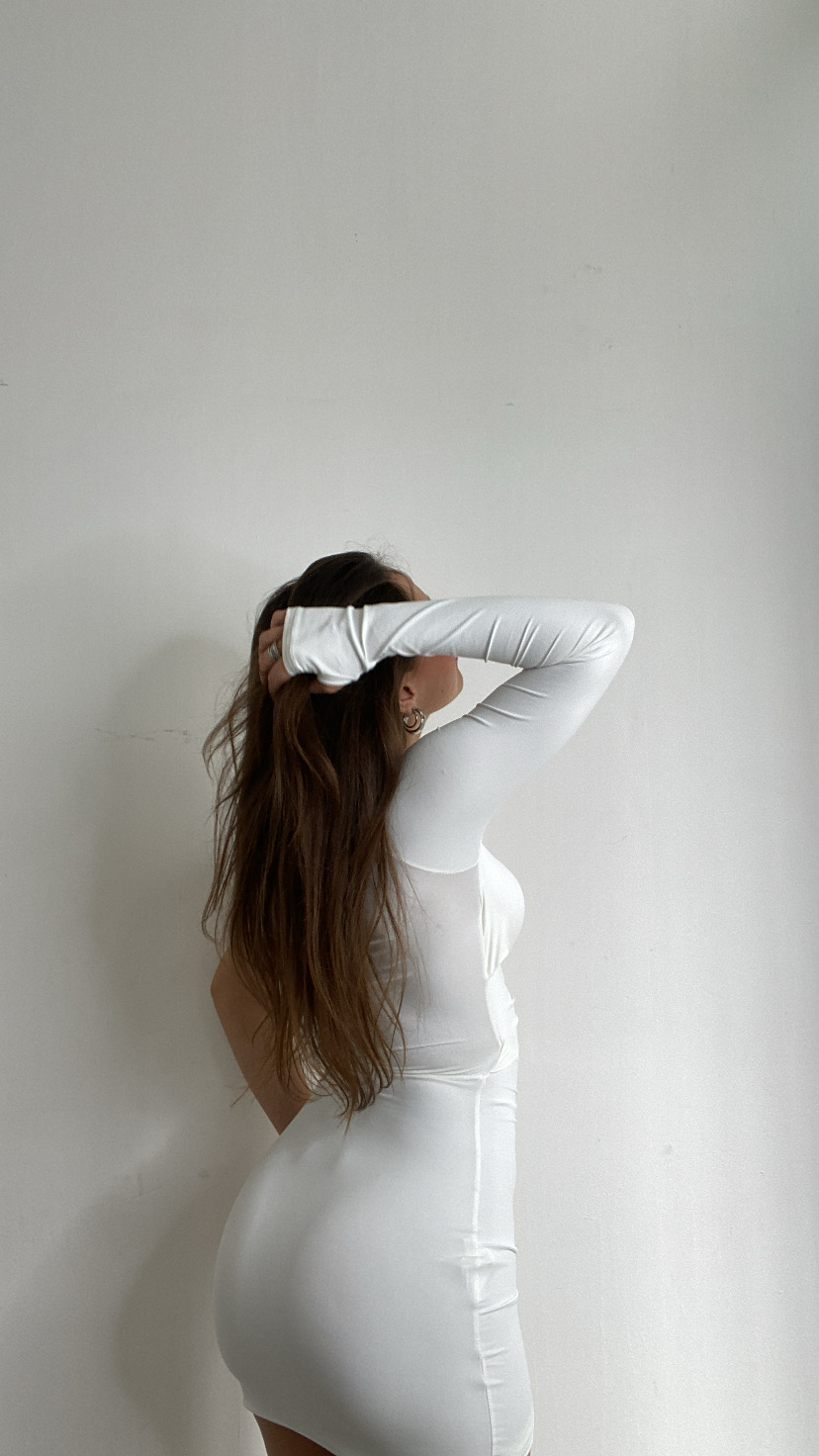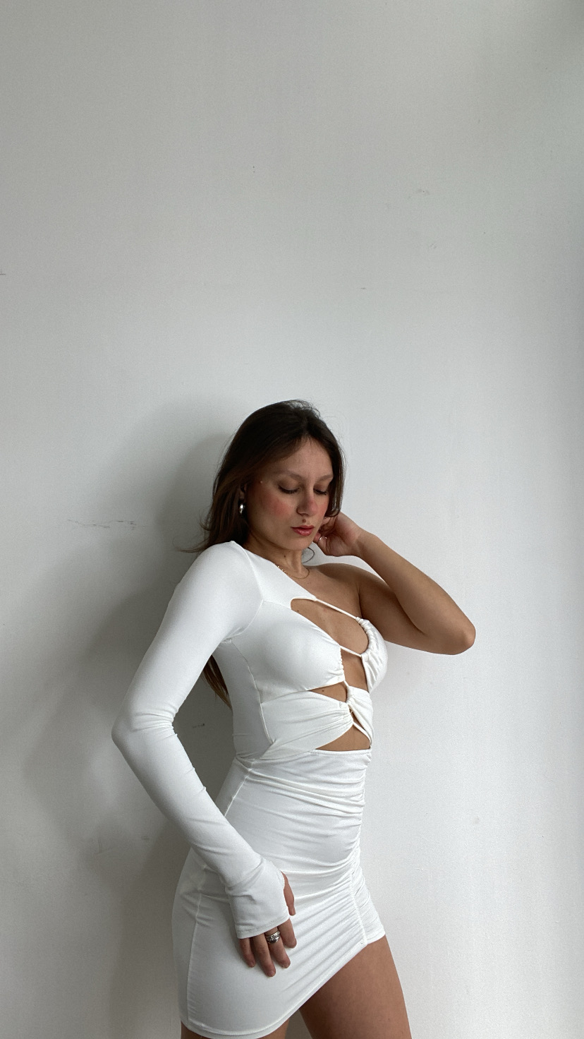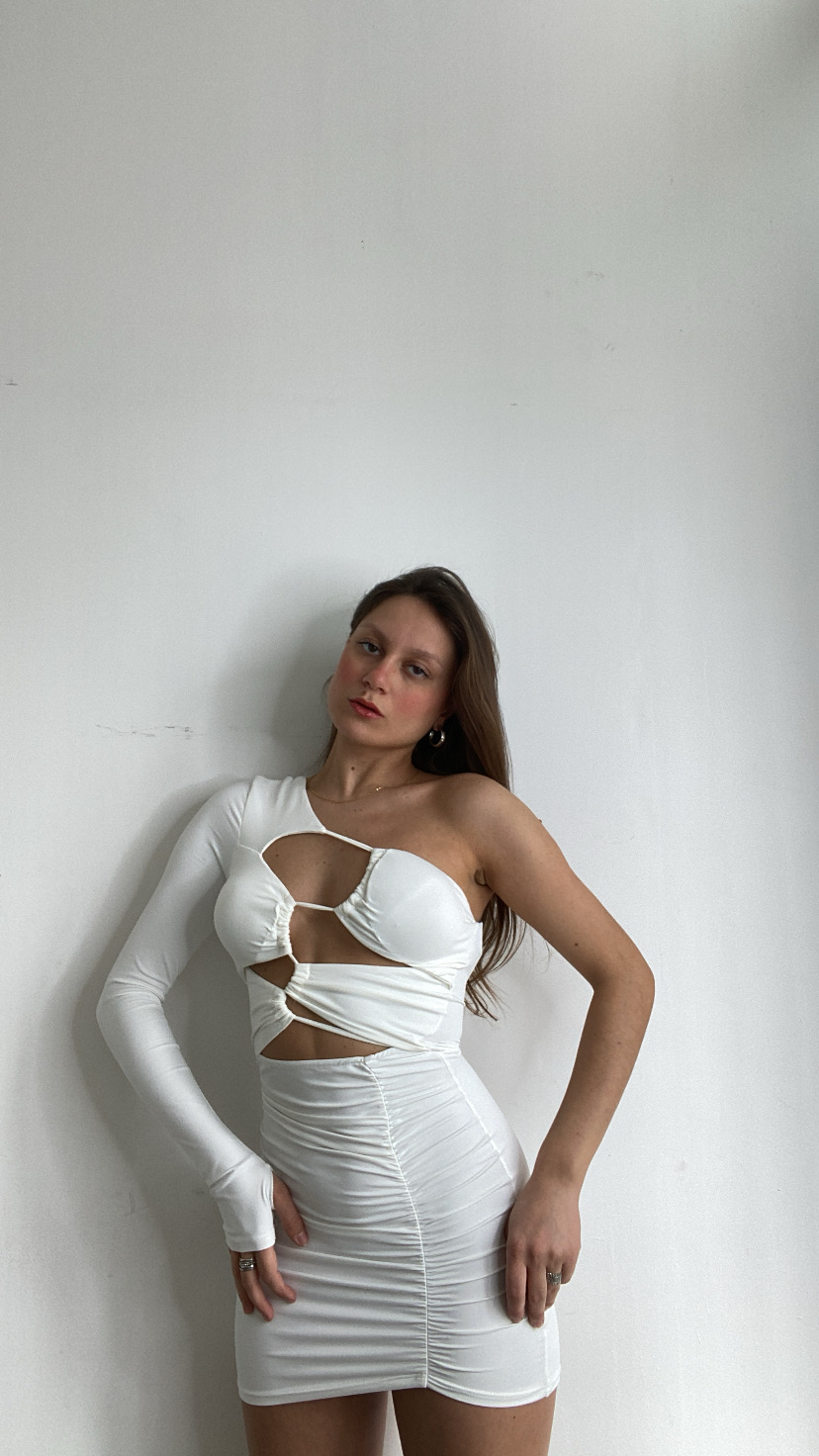 Vestito corto mono spalla a guanto scollatura intrecciate e drappeggio avanti elastico coppe preformate