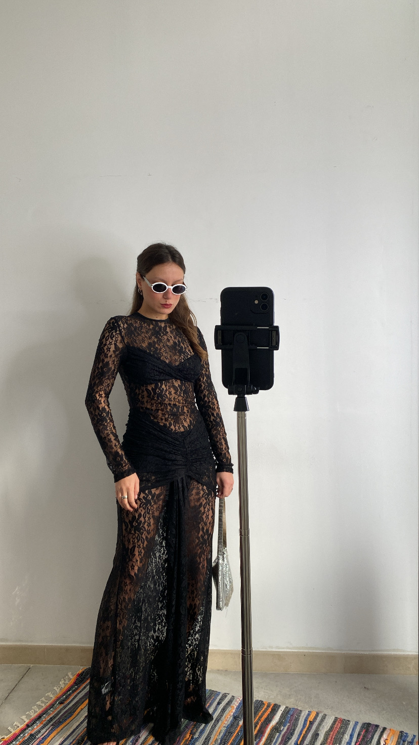 Vestito a maniche lunghe in pizzo e trasparenze lungo con strascico davanti le parti interessante sono foderate, elastico zip sulla parte posteriore lungo la schiena invisibile
