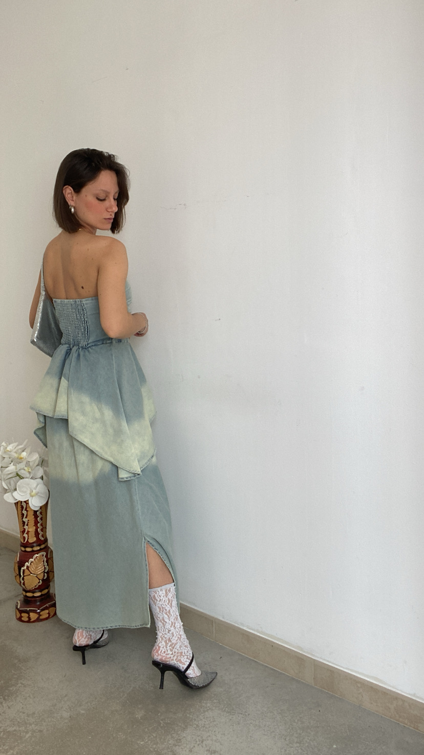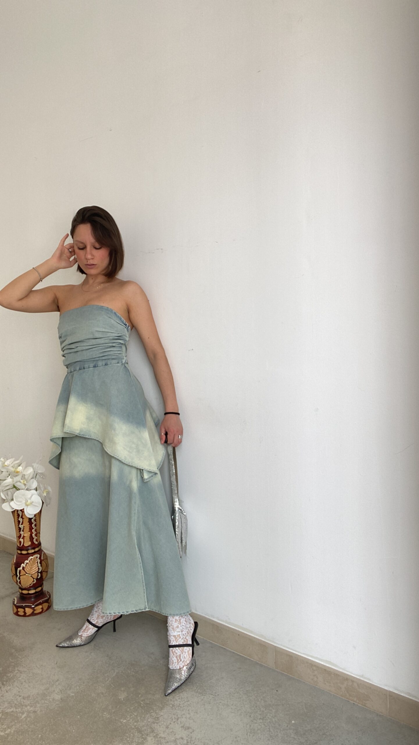 Vestito lungo in jeans lavaggio chiaro sfumato con scollo dècolletè drappeggiato avanti con aggiunta di tessuto medio spacco laterale sul fondo zip laterale invisibile elastico sul retro fit regolare 36/44 italiana