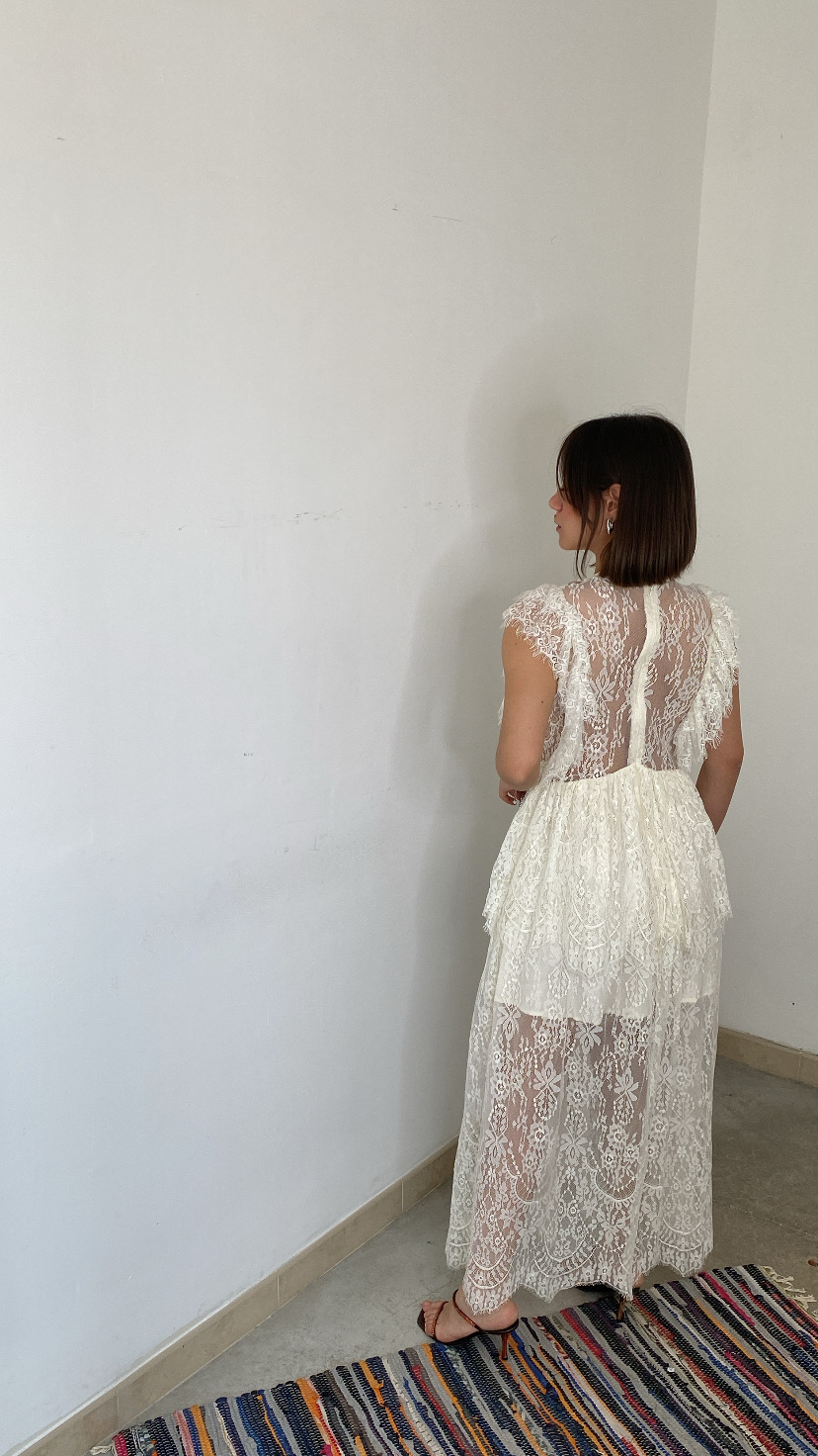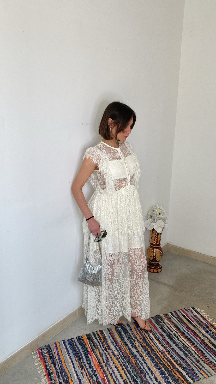 Vestito lungo giro manica  in pizzo e trasparenze parte interessata foderata sfilza di bottoni gioiello avanti  zip sul retro invisibile 38/44 italiana