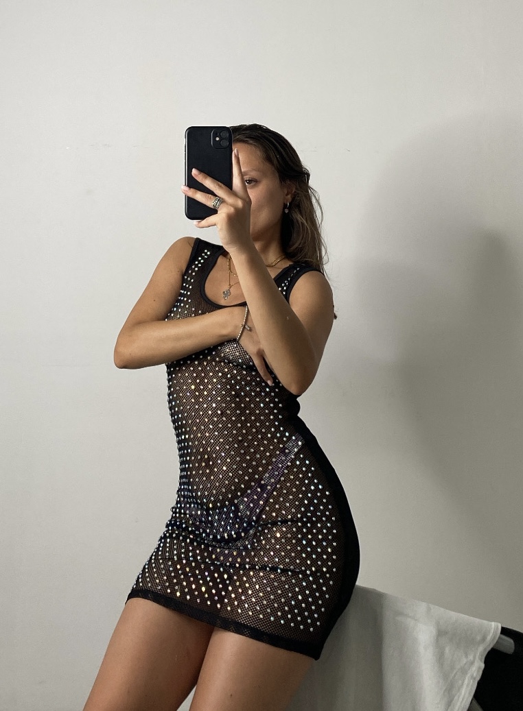 Vestito a rete, rivestito da paillettes sul davanti, total trasparente