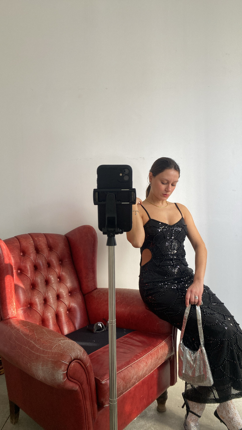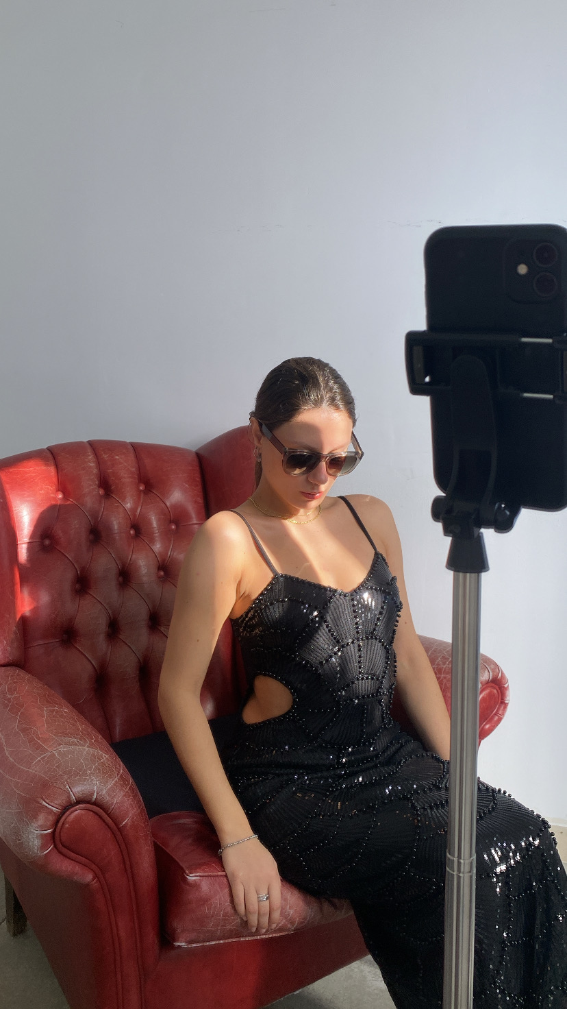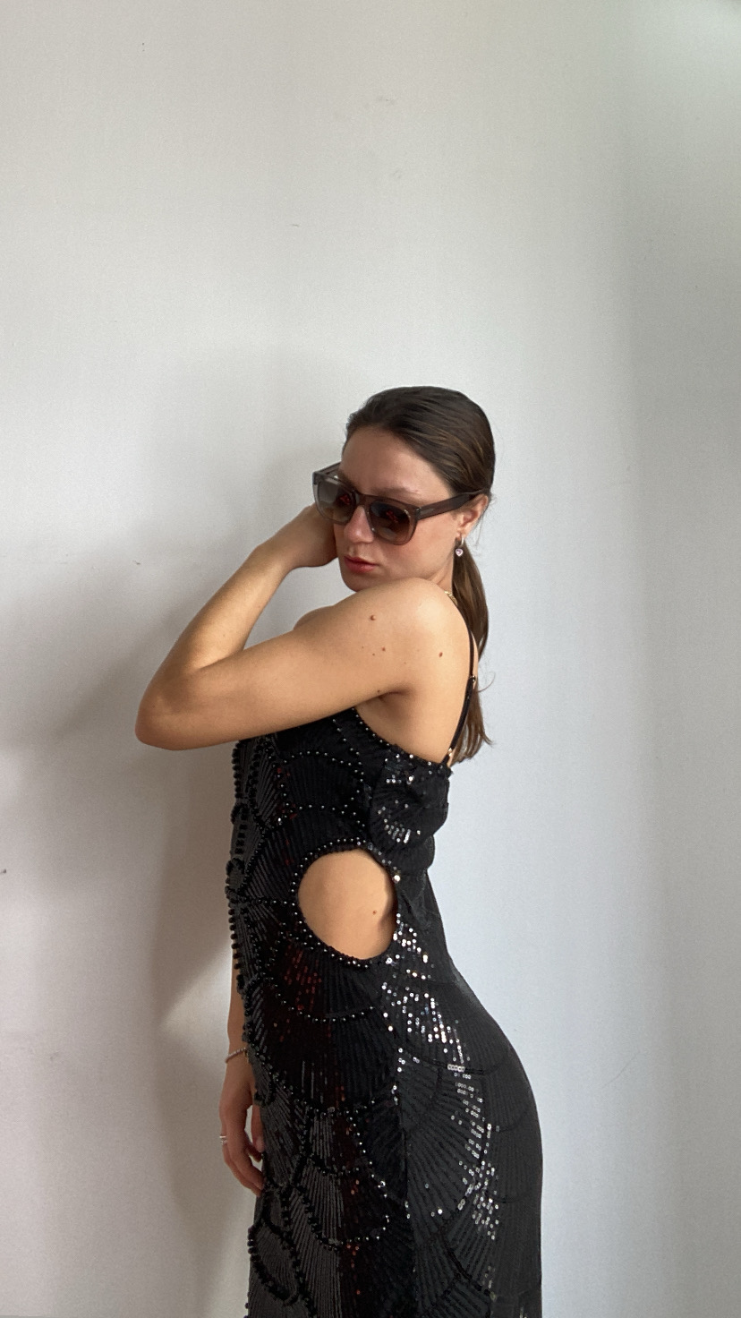 Vestito lungo aderente con bretelle regolabili paillettes e perle tono su tono con cut out laterali zip sul retro invisibile