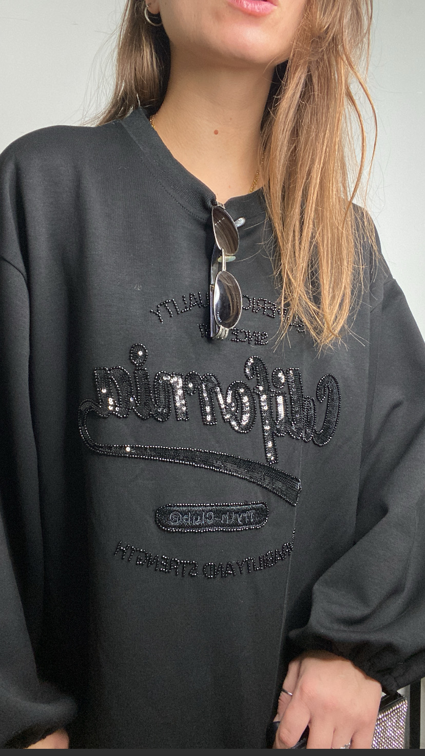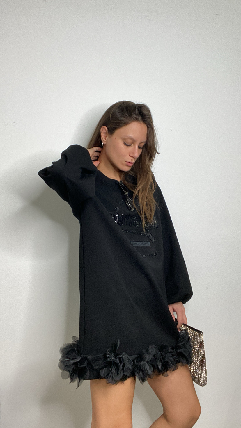Vestito nero in tessuto cin scritte avanti tono su tono di paillettes maniche svasate con elastico e orlo ricoperto da foglie in tulle 36/46